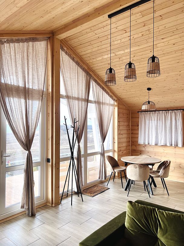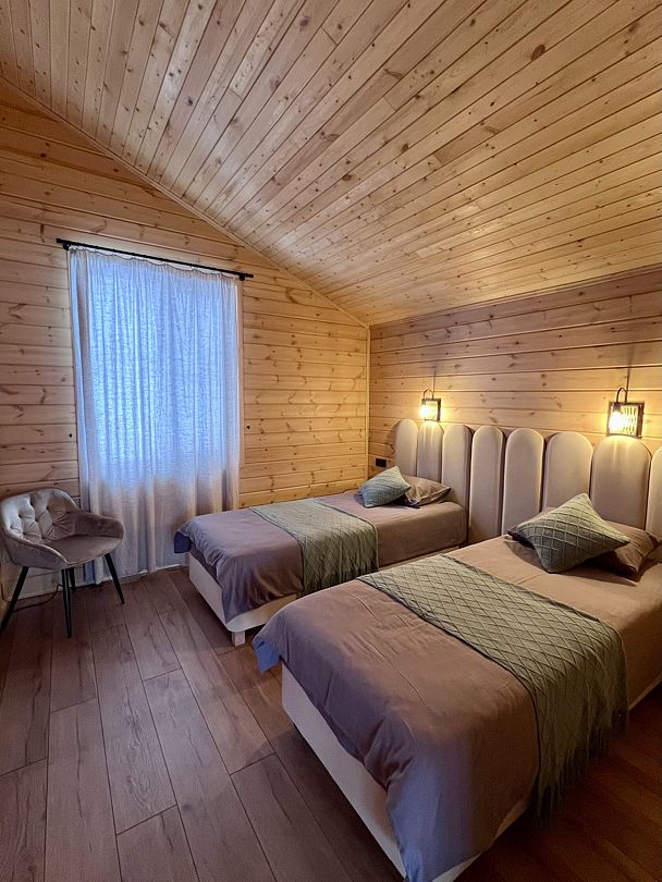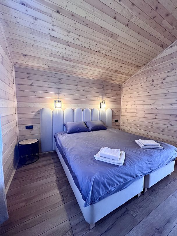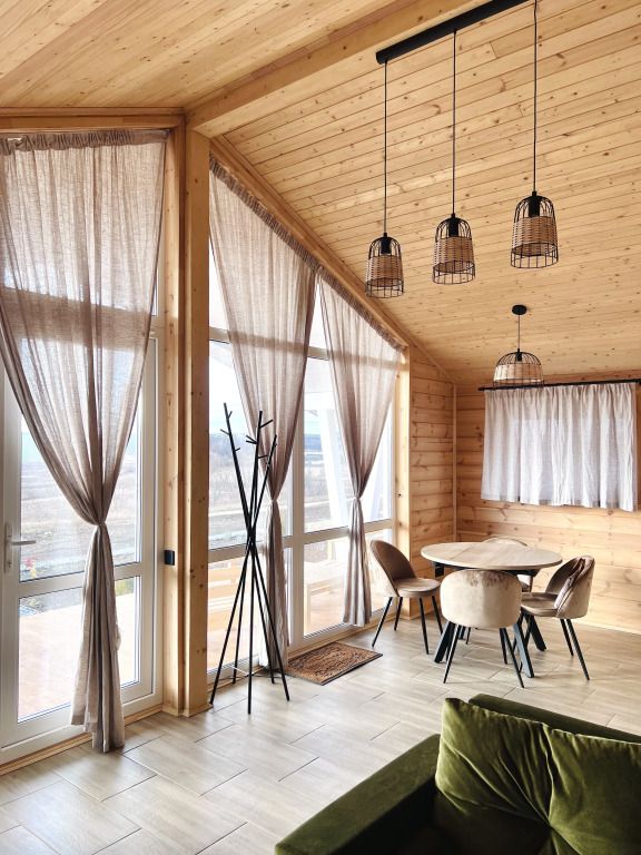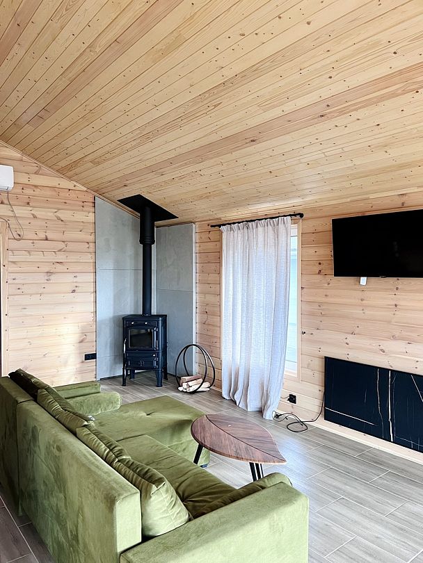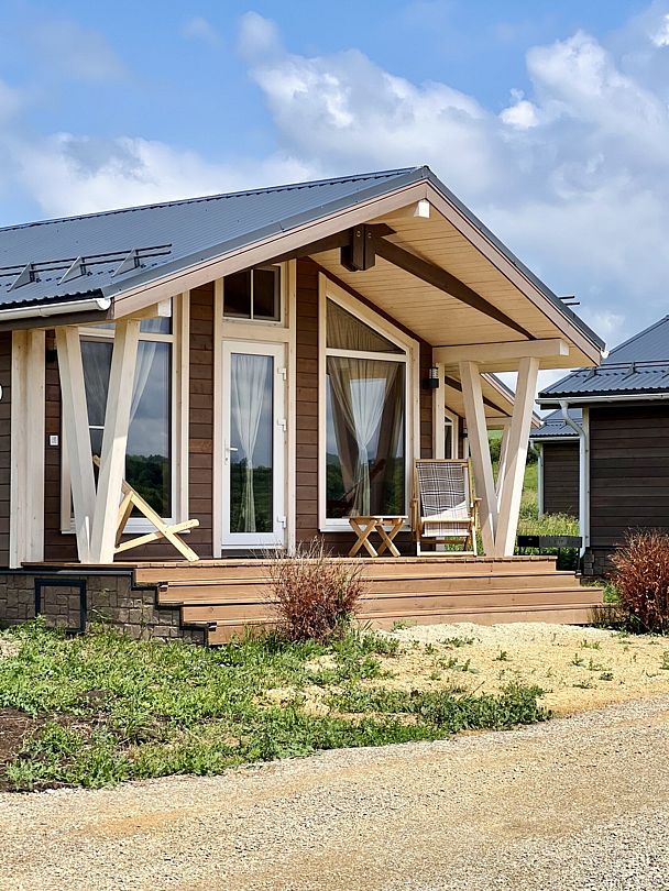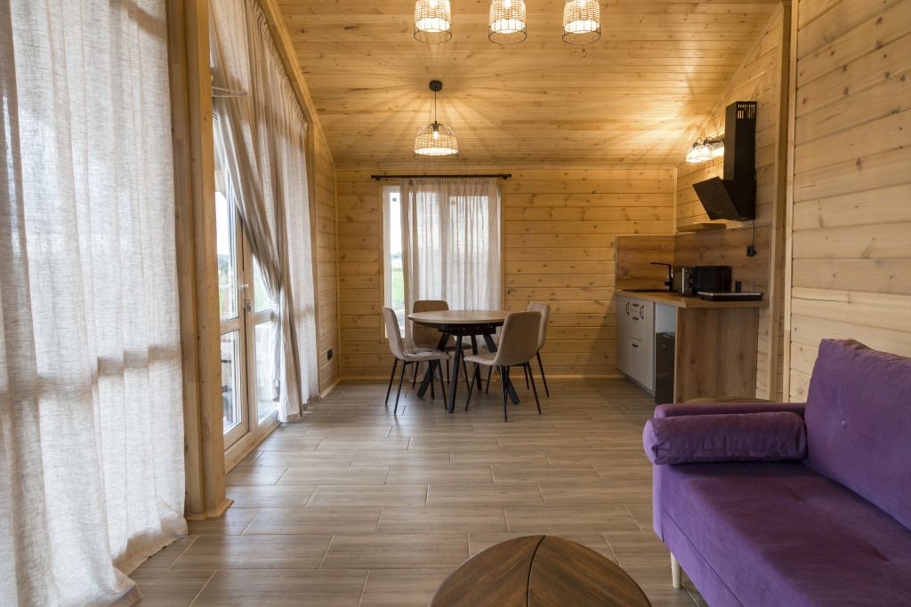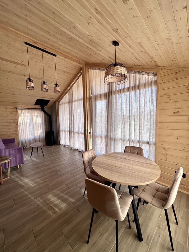 Уютные деревянные коттеджи с террасами и панорамным видом на окрестности предлагают комфортное размещение с удобными кроватями, обновлёнными ванными комнатами и полностью оборудованными кухнями. Тепло домашнего очага обеспечит печь, а уютную атмосферу — интерьер в натуральных древесных тонах. Для любителей отдыха на природе предлагаются комфортабельные сафари-тенты.