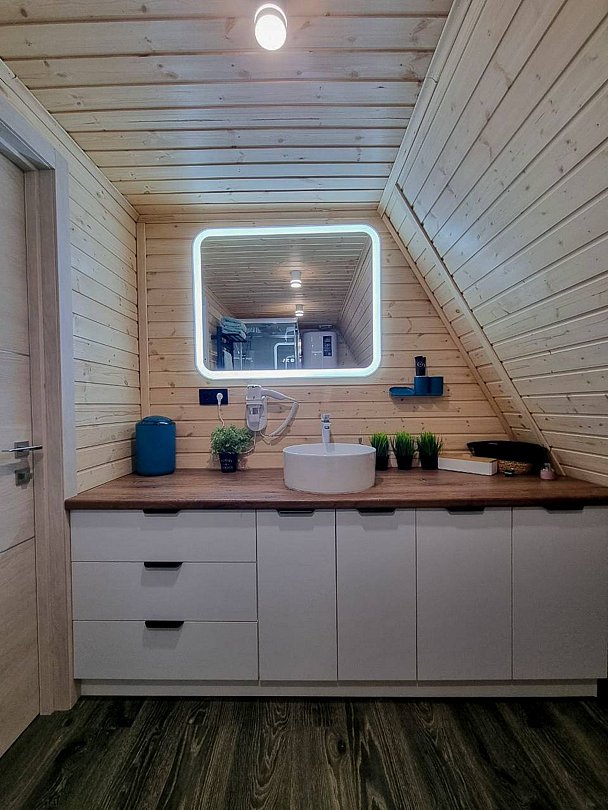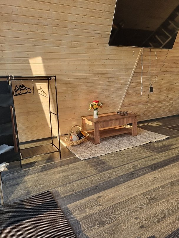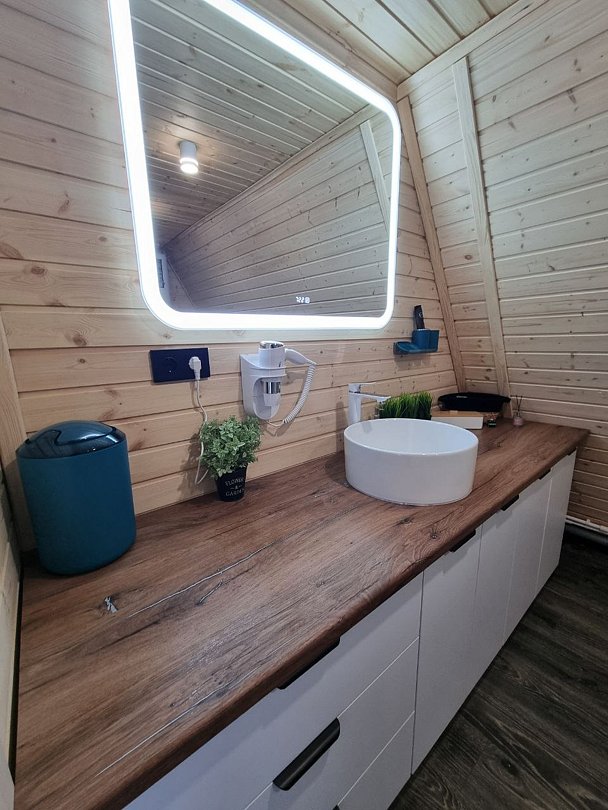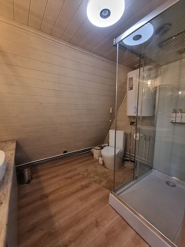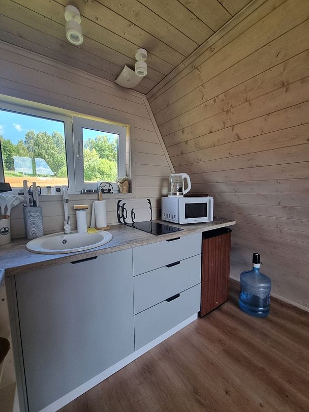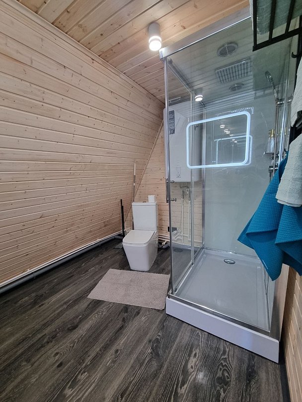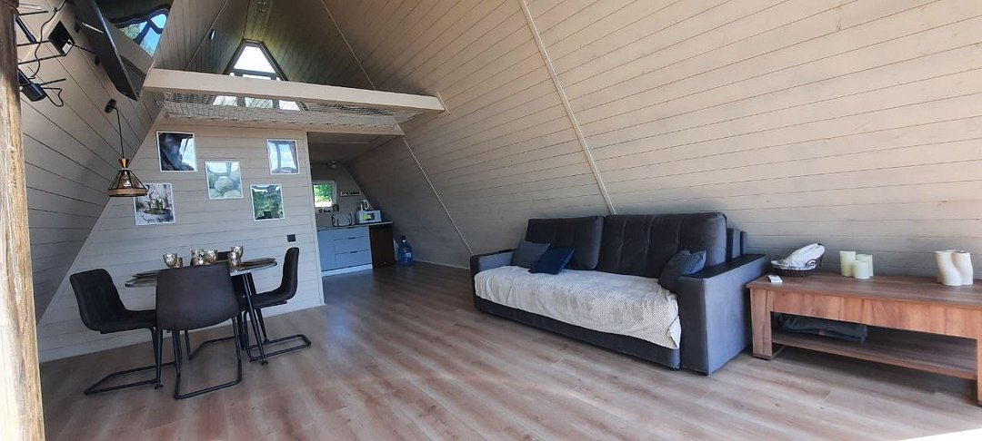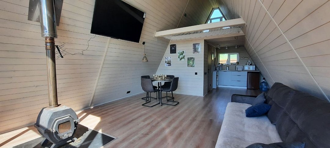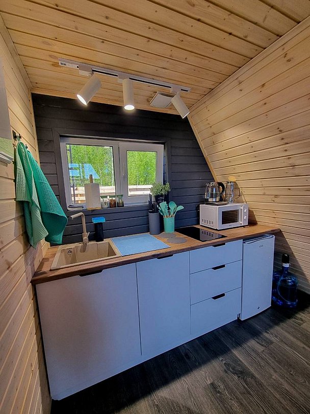 Каждый домик оборудован всем необходимым для комфортного отдыха. На территории вы найдете купель на дровах и баню, где можно отлично расслабиться и восстановить силы.