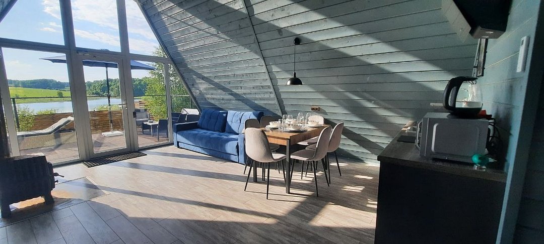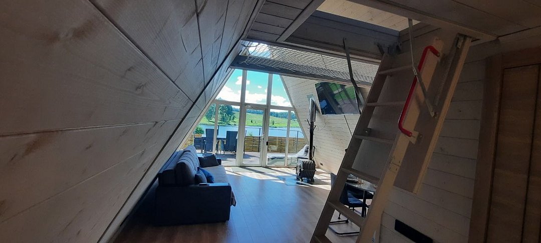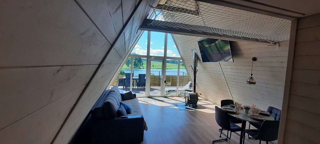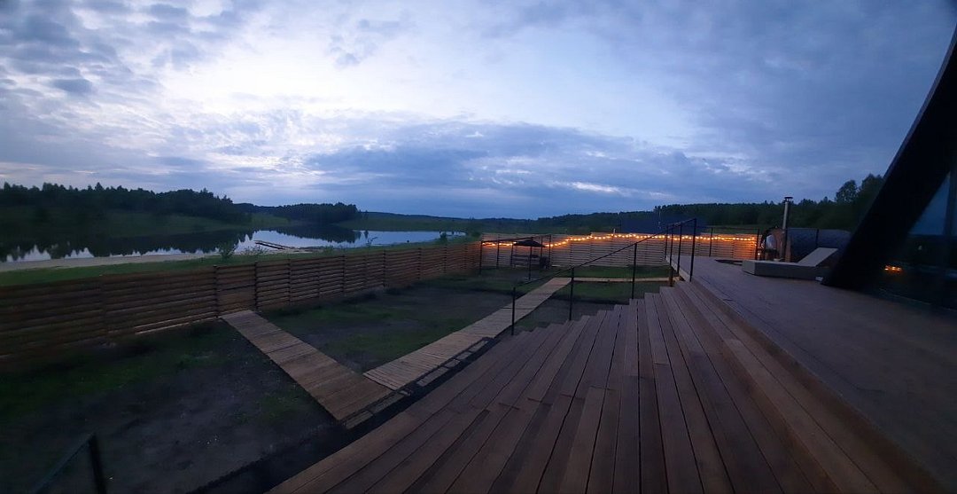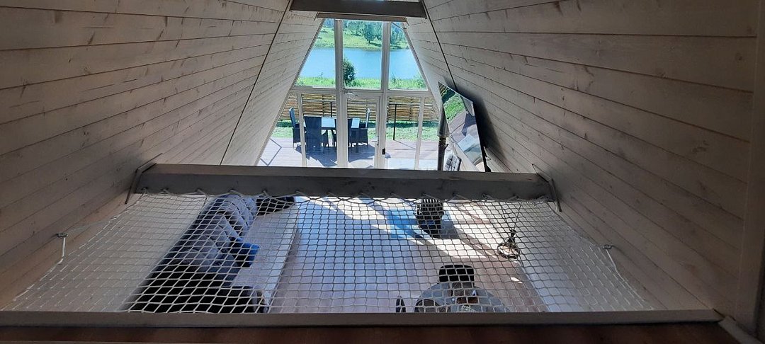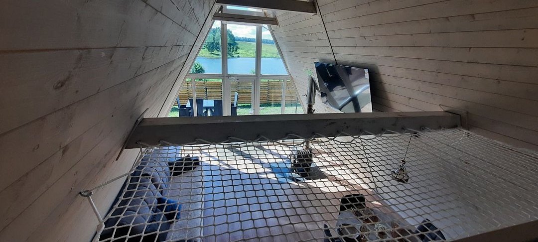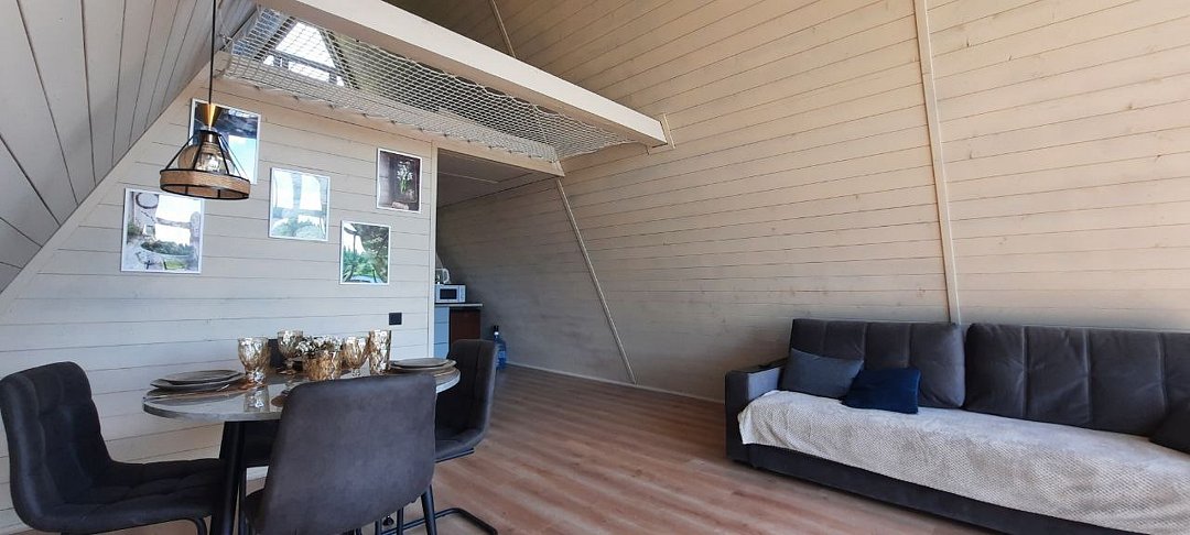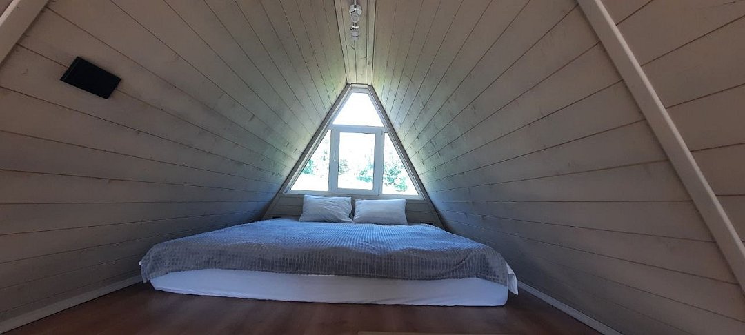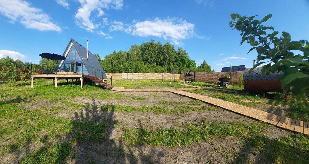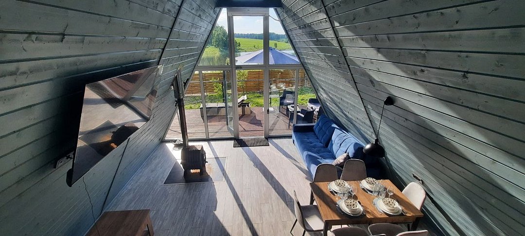 Уютные треугольные домики, расположенные на берегу пруда, идеально подходят для семейных торжеств, романтических вечеров и спокойных выходных вдали от городской суеты.