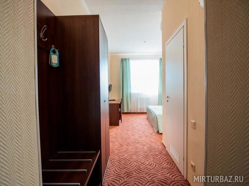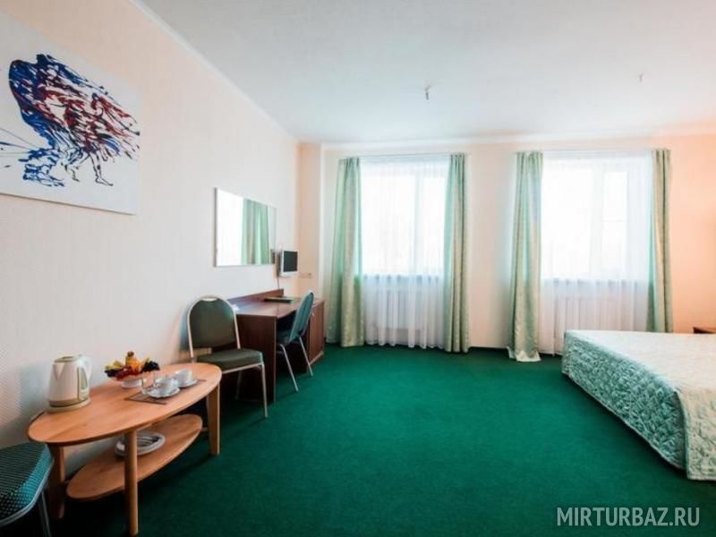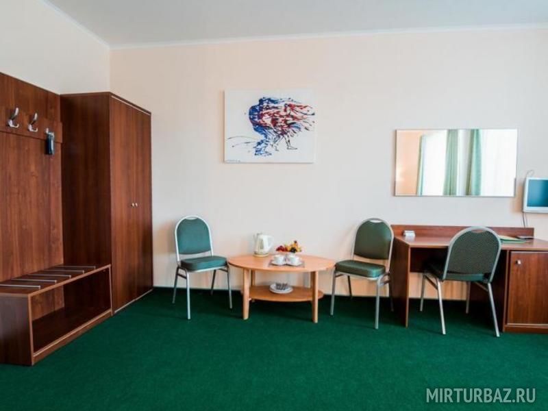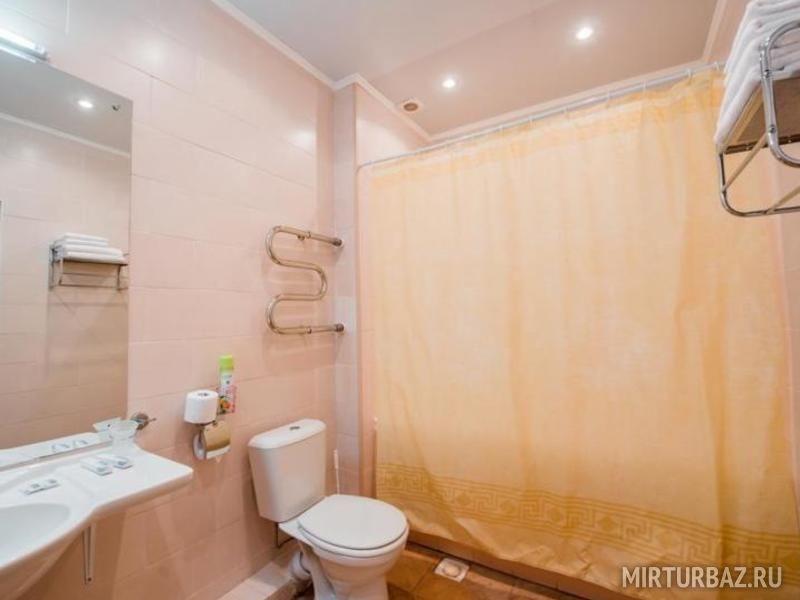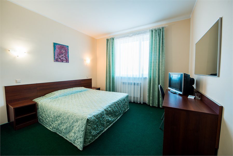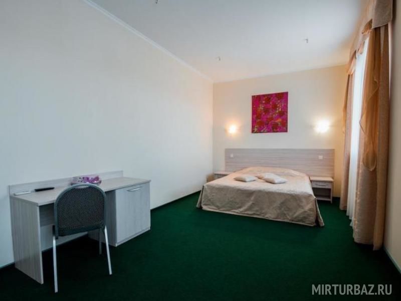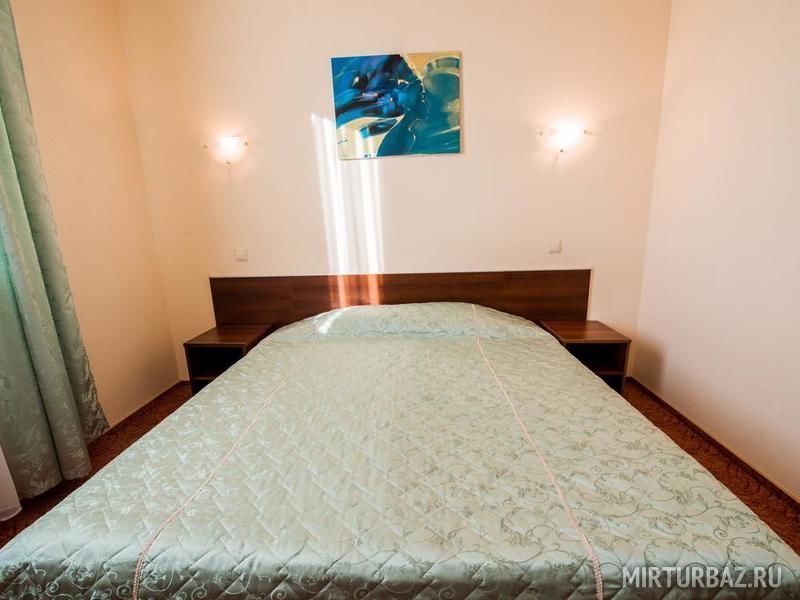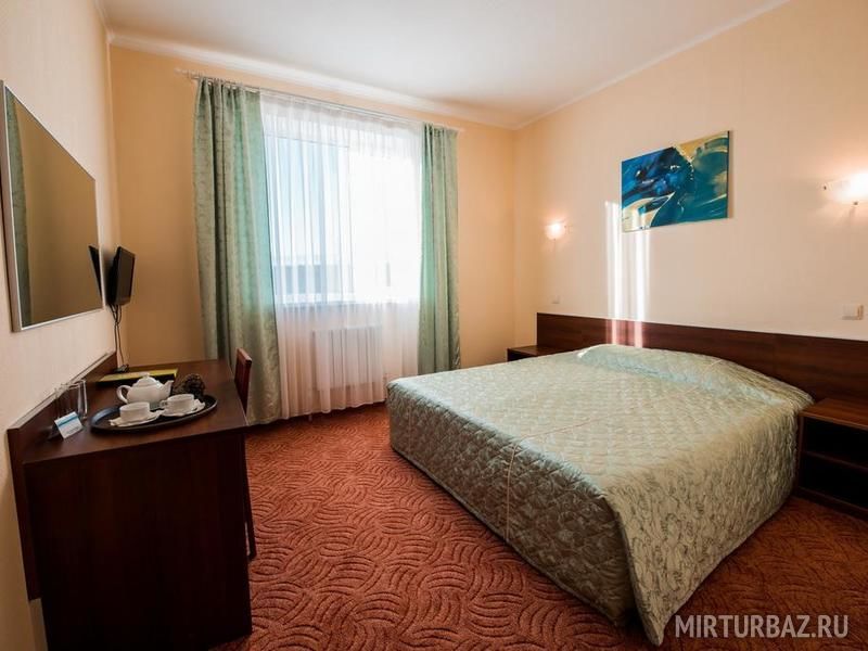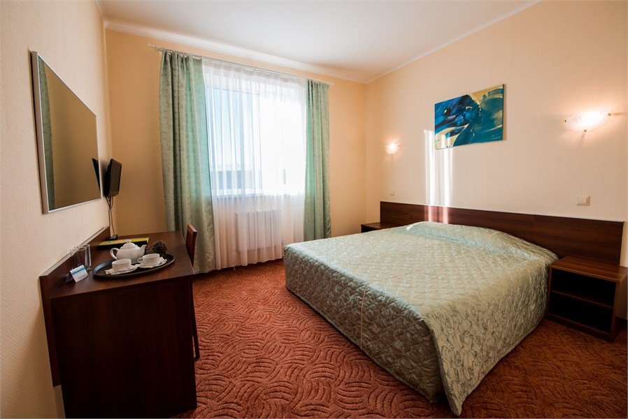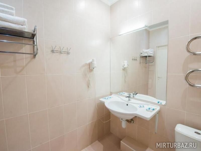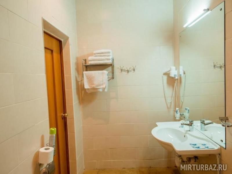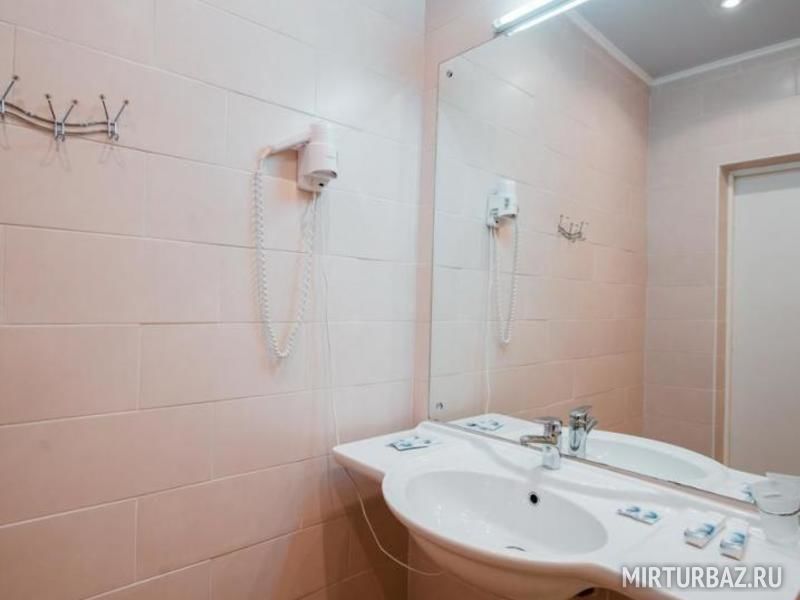 В номере: две кровати, универсальный стол, телевизор, стол, тумбочки, душ. Скомплектован одноразовыми принадлежностями, халатами. Дополнительно: холодильник, чайник, набор посуды.