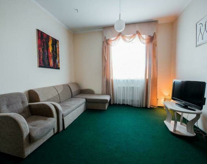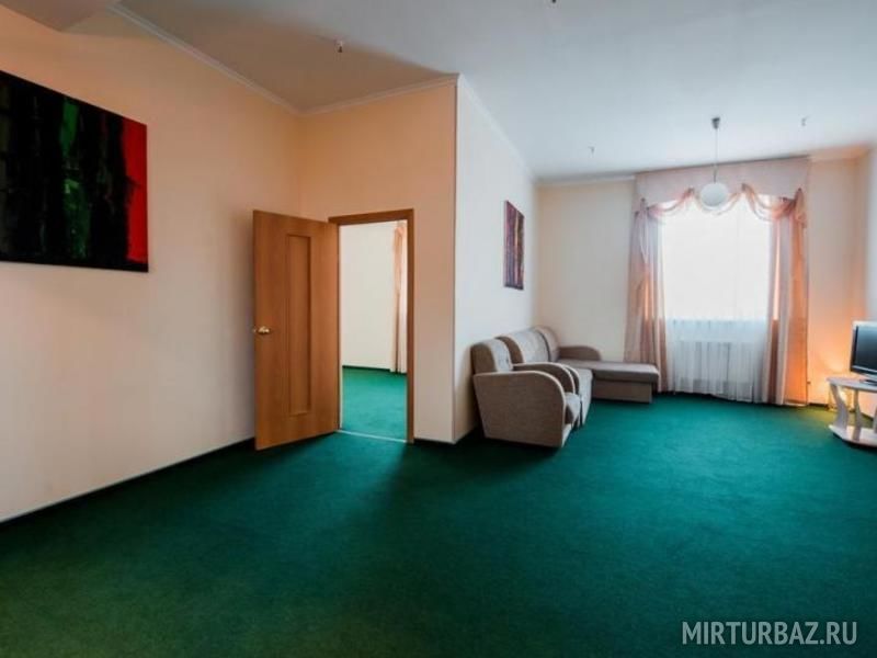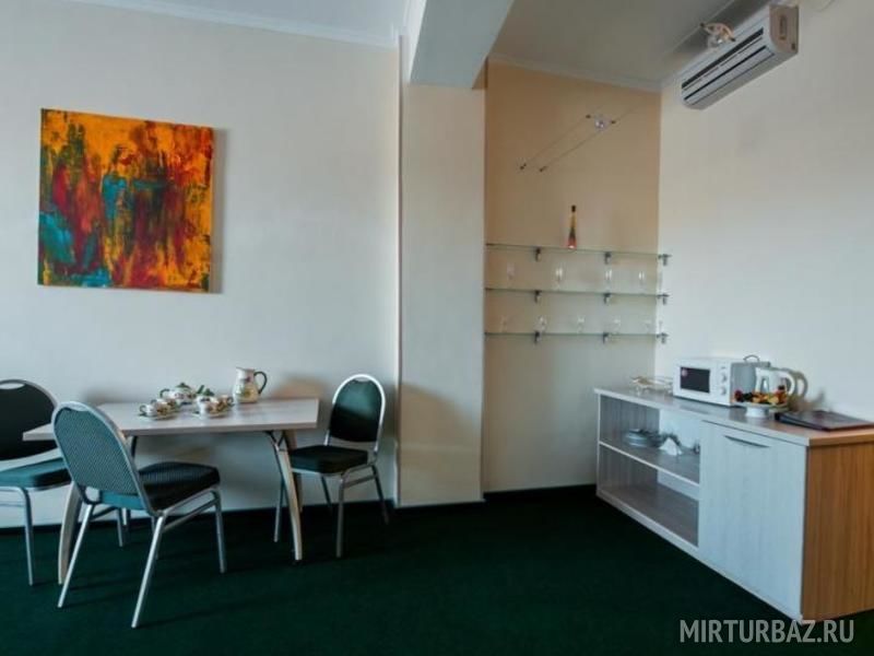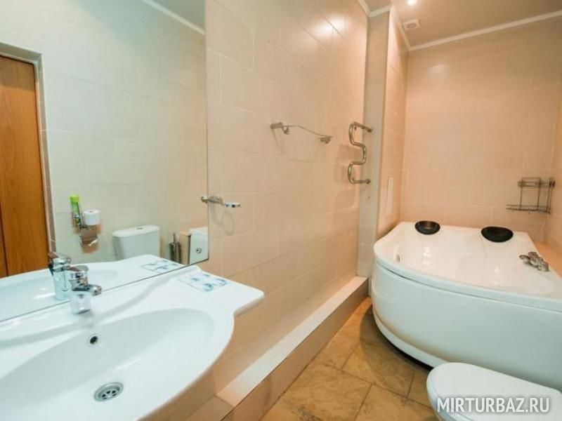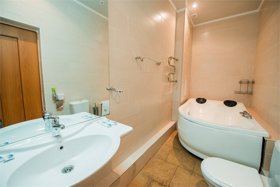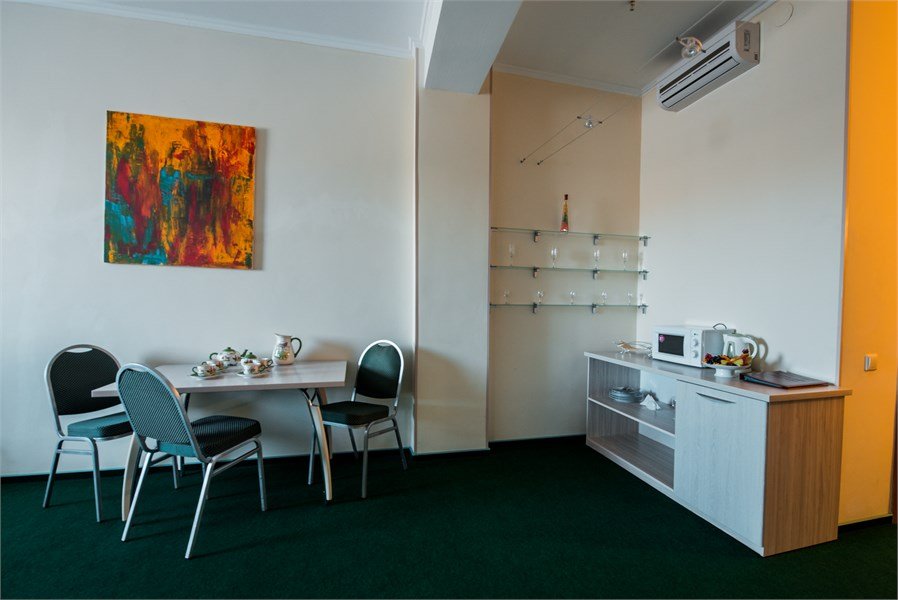 Люкс с кондиционером, телевизором, мини-баром и феном. Также в числе удобств мини-кухня с холодильником, микроволновой печью и электрическим чайником. В ванной комнате установлена гидромассажная ванна и приготовлены фен, халаты и тапочки.