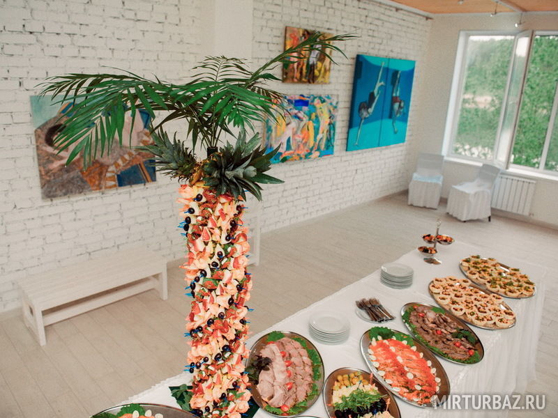 Из панорамных окон банкетного зала открывается прекрасный вид на лес и пруд, а стены украшают подлинные произведения искусства — картины, написанные известными художниками из разных стран мира.