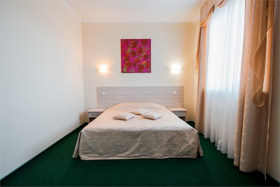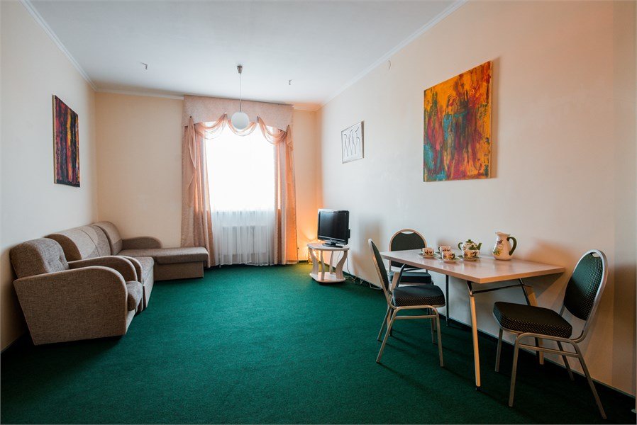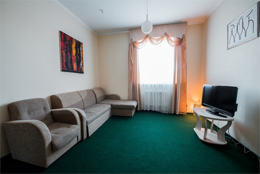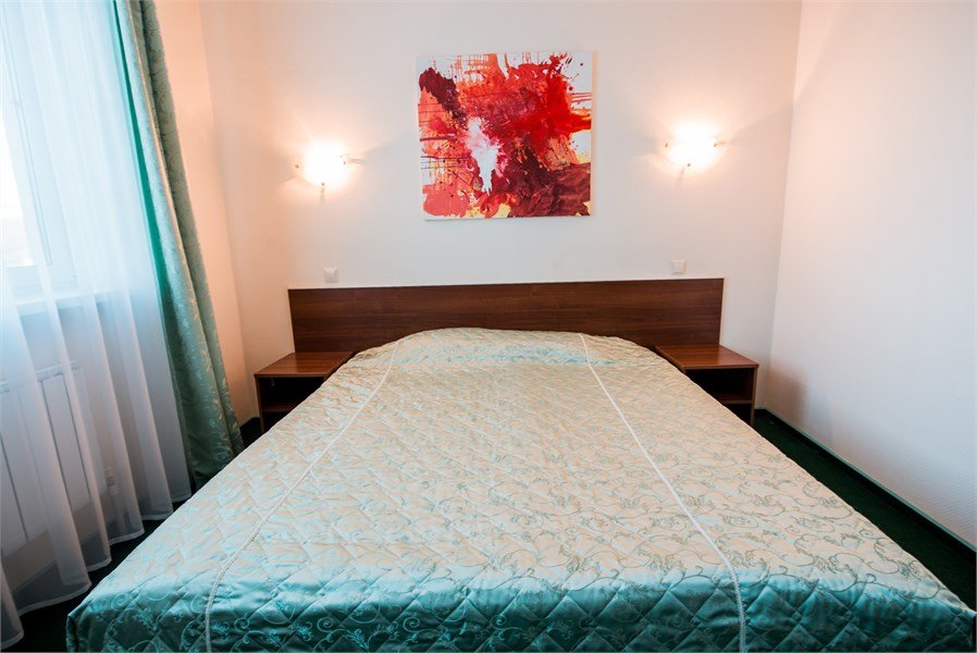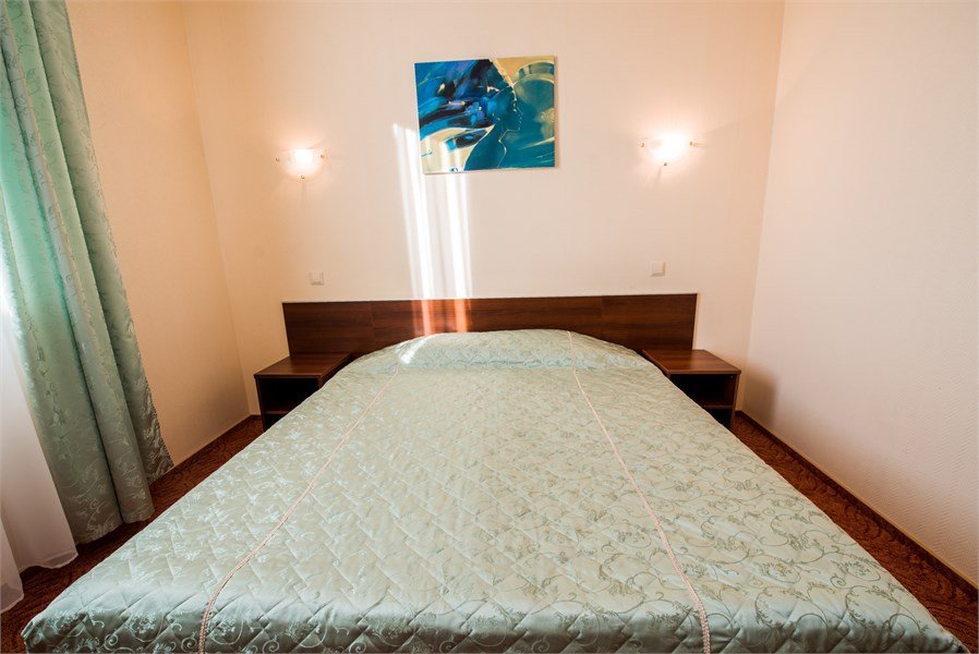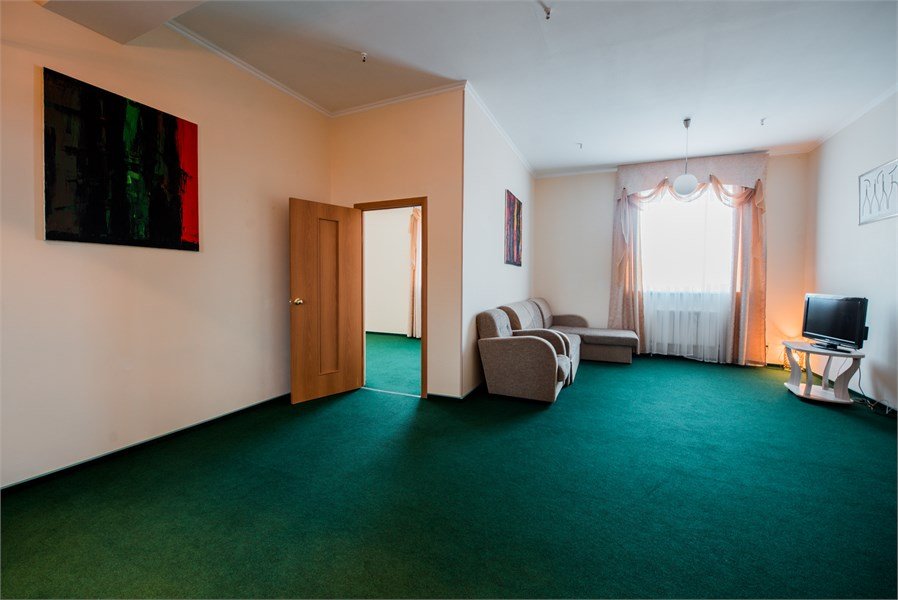 Двухкомнатный. В одной - кровать, прикроватные тумбы, ЖК-телевизор, стол; в другой - диван, ЖК-телевизор, шкаф-купе, обеденный стол. Санузел совмещенный (джакузи). Номер скомплектован одноразовыми принадлежностями.Услуги и удобства