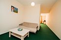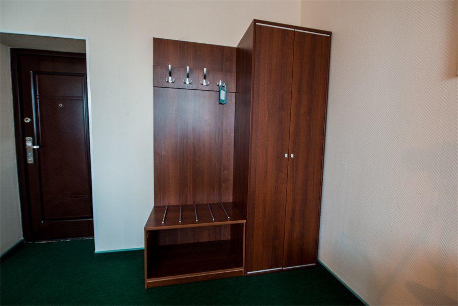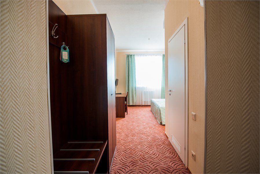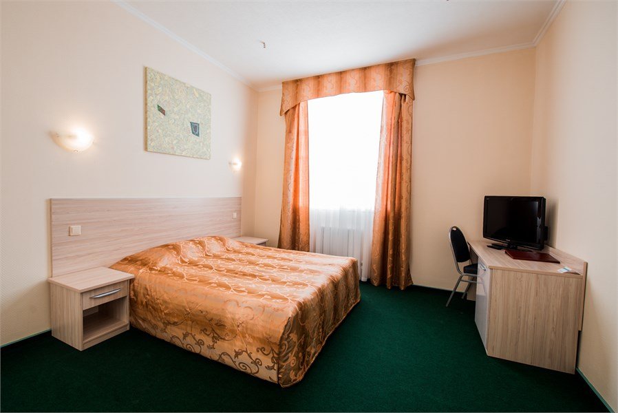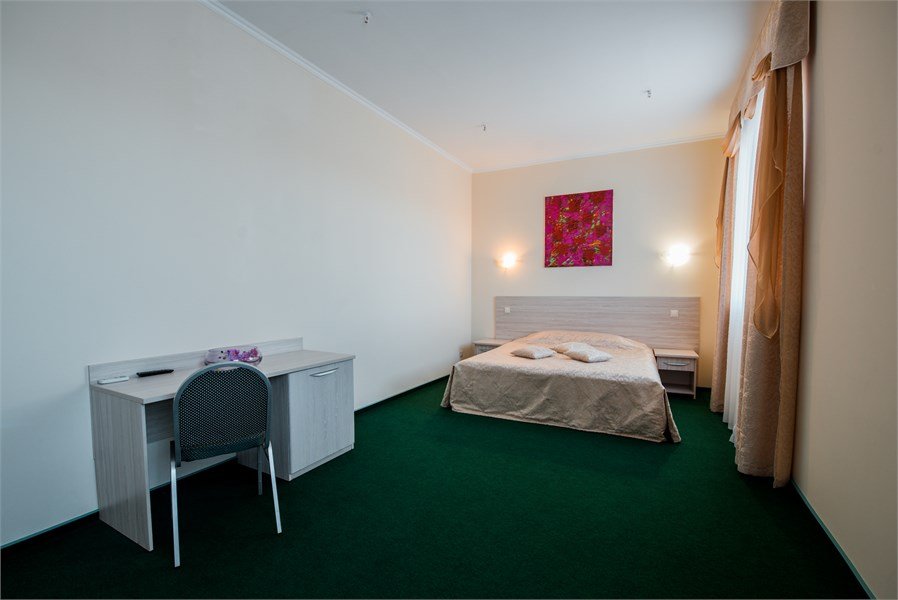 Однокомнатный, условно разделен на части. В одной - кровать, прикроватные тумбы, ЖК-телевизор; в другой - диван, стол, шкаф-купе. Санузел совмещенный (ванна). Номер скомплектован одноразовыми принадлежностями.Услуги и удобства