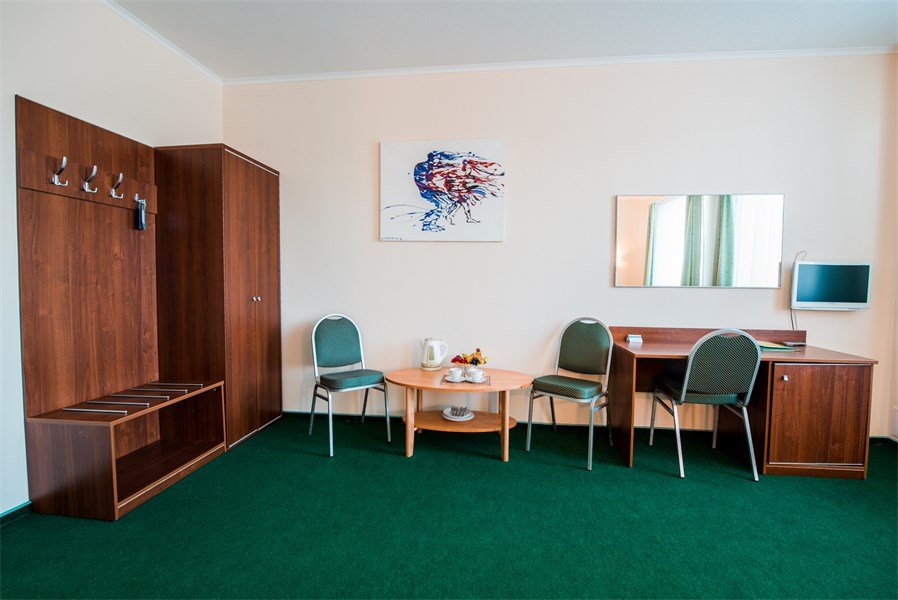 телевизор, Wi-Fi, холодильник, кондиционер, фен, микроволновая печь, ванная комната, ванна, халаты, банные полотенца, тапочки, гигиенические средства, две односпальные или большая двуспальная кровать, диван, тумбы, стулья, шкаф для одежды, вешалки, журнальный столик, письменный стол, багажная тумба, зеркало, набор посуды, обслуживание номеров, чайник, унитаз, раковина, гостиная зона, ковровое покрытиеВ гостиничном номере