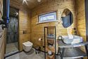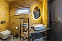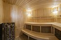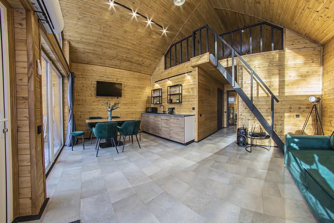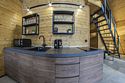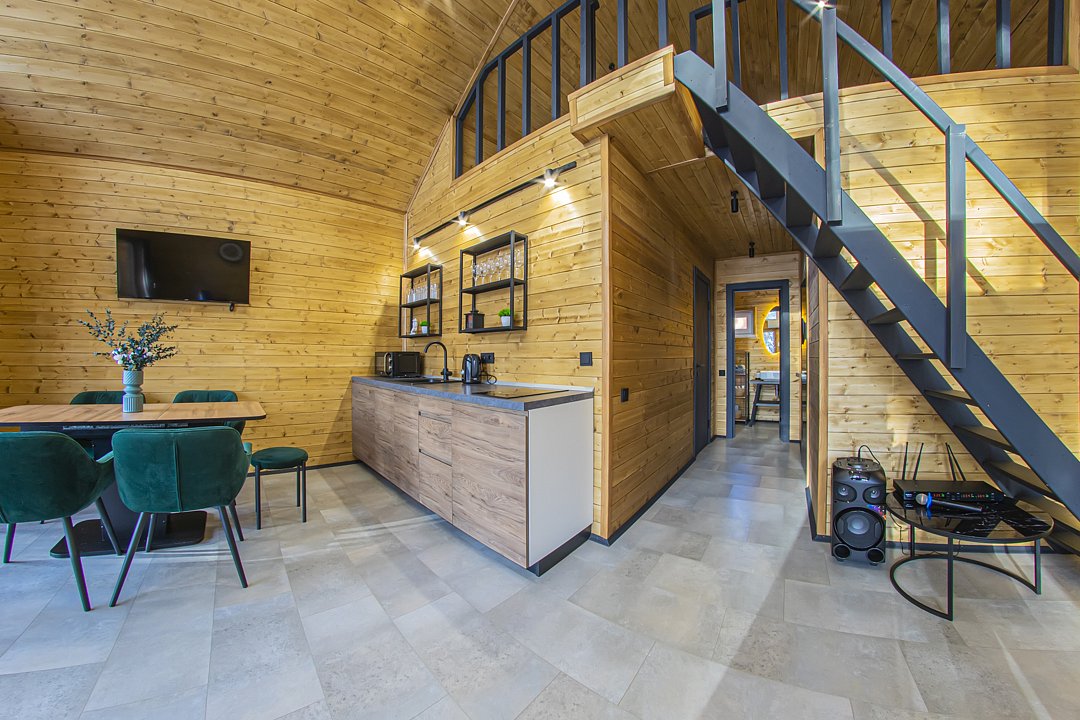 На первом этаже есть спальная комната, оборудованная кухня и гостиная с обеденным столом для посиделок. А еще можно попариться в жаркой сауне.