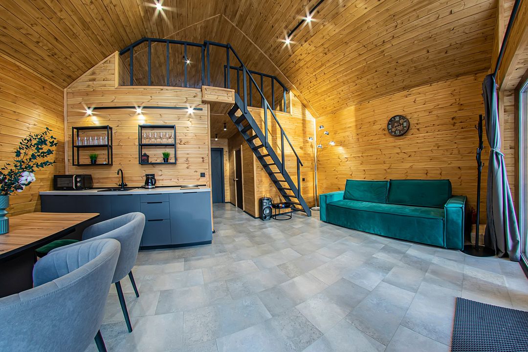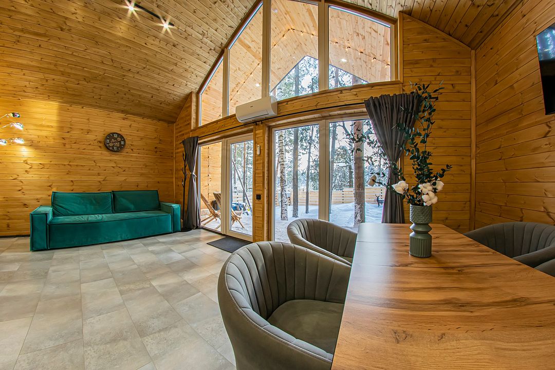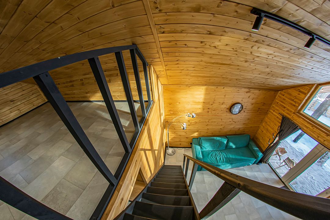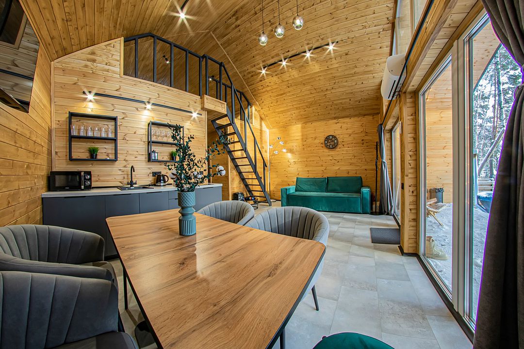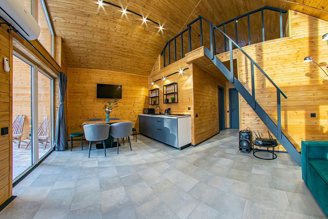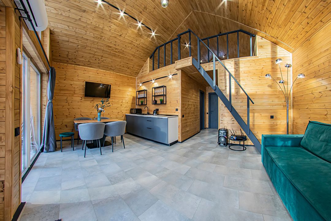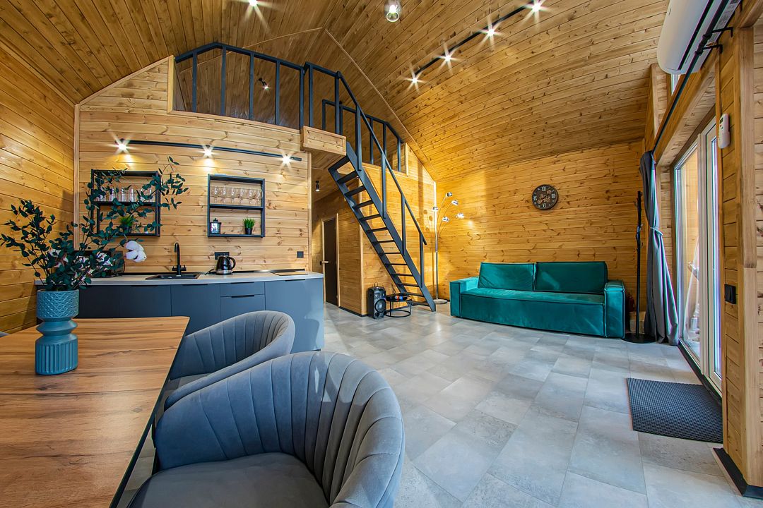 а первом этаже есть спальная комната, оборудованная кухня и гостиная с обеденным столом для посиделок. А еще можно попариться в жаркой сауне.