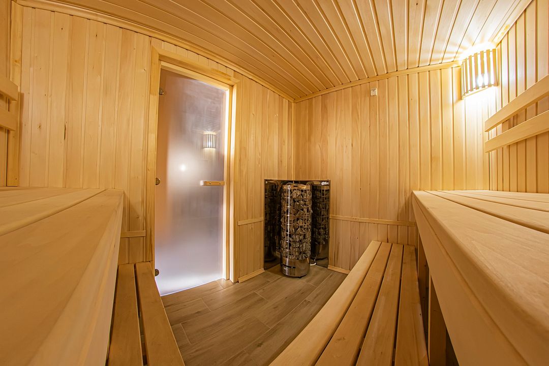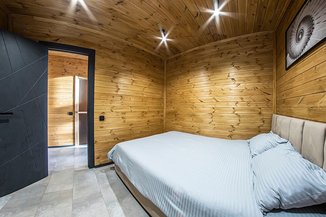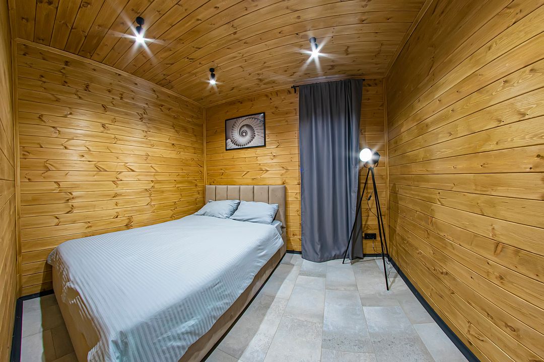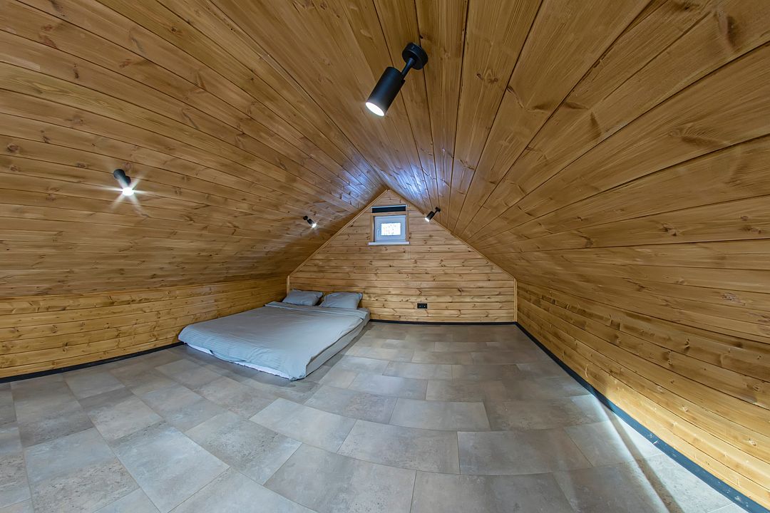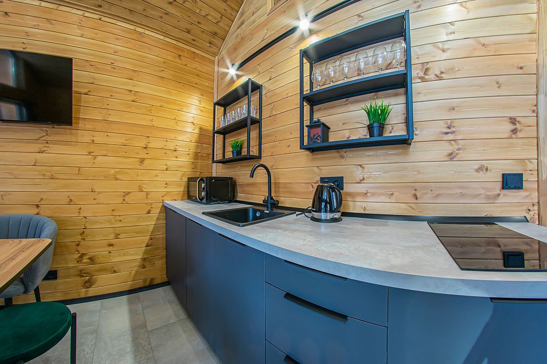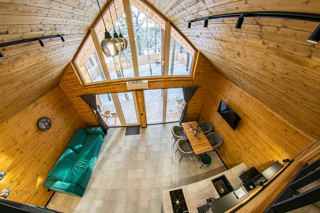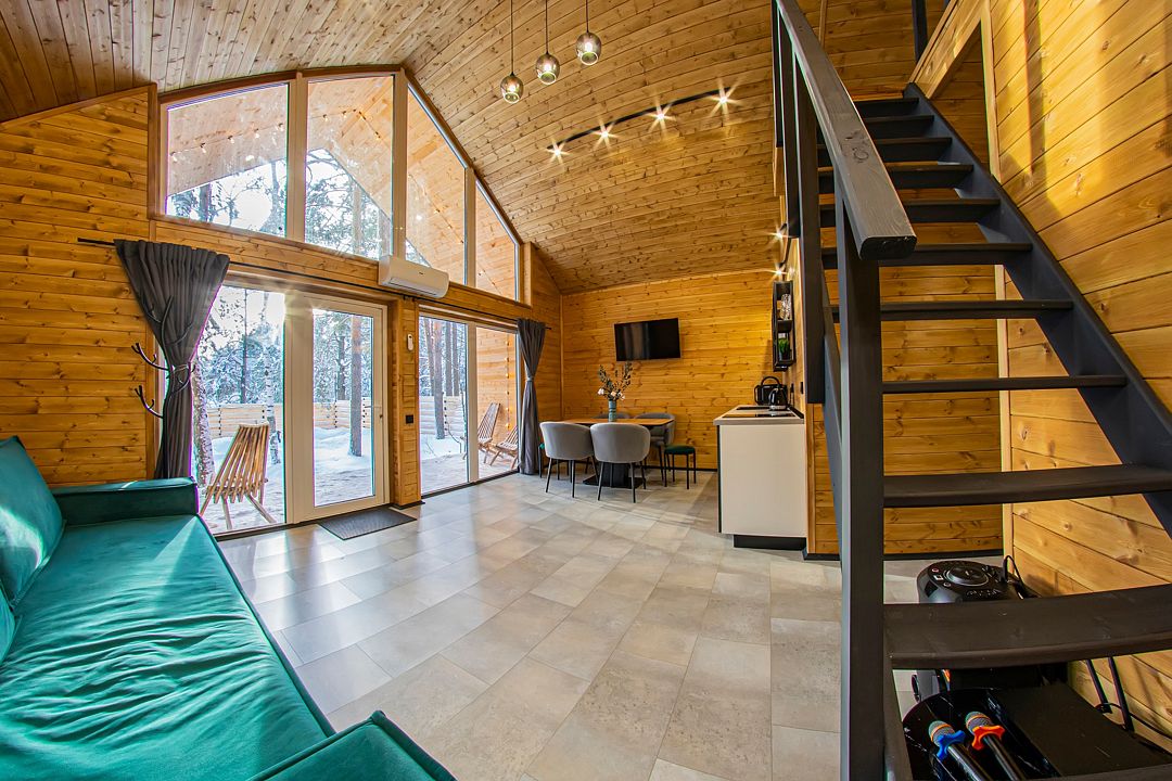 а первом этаже есть спальная комната, оборудованная кухня и гостиная с обеденным столом для посиделок. А еще можно попариться в жаркой сауне.