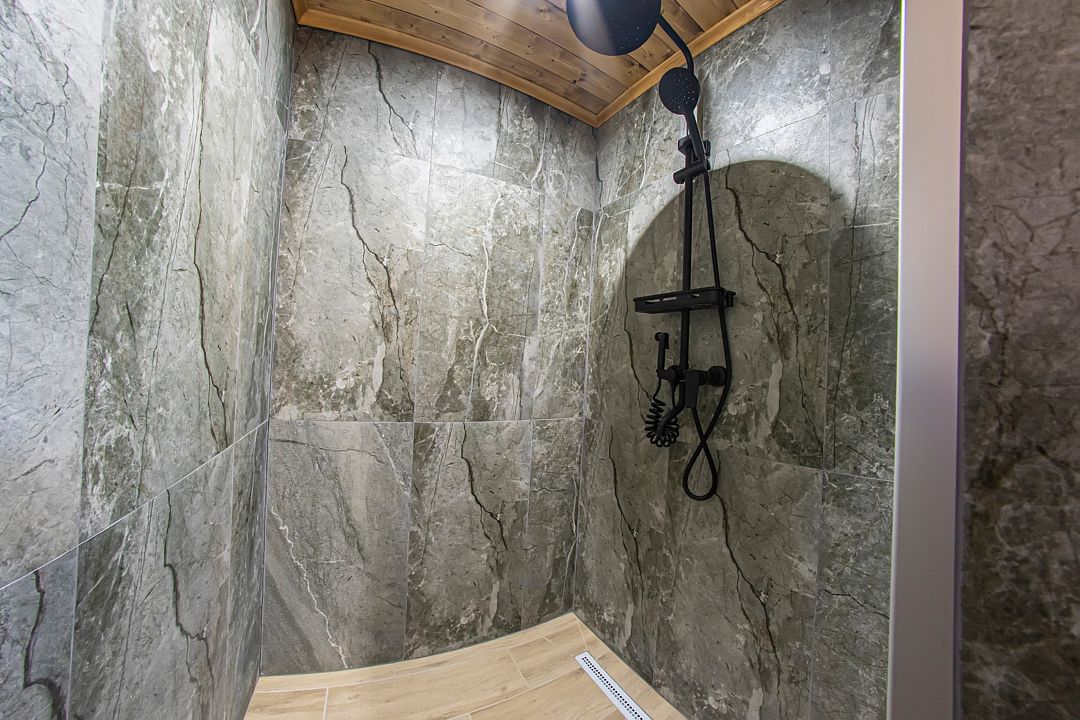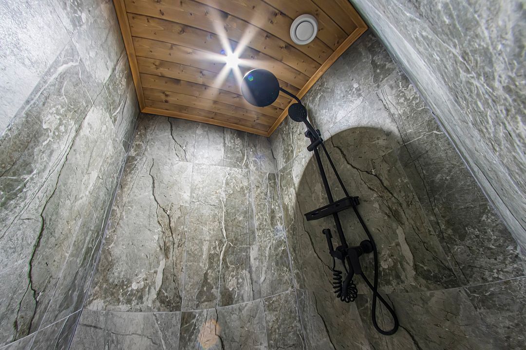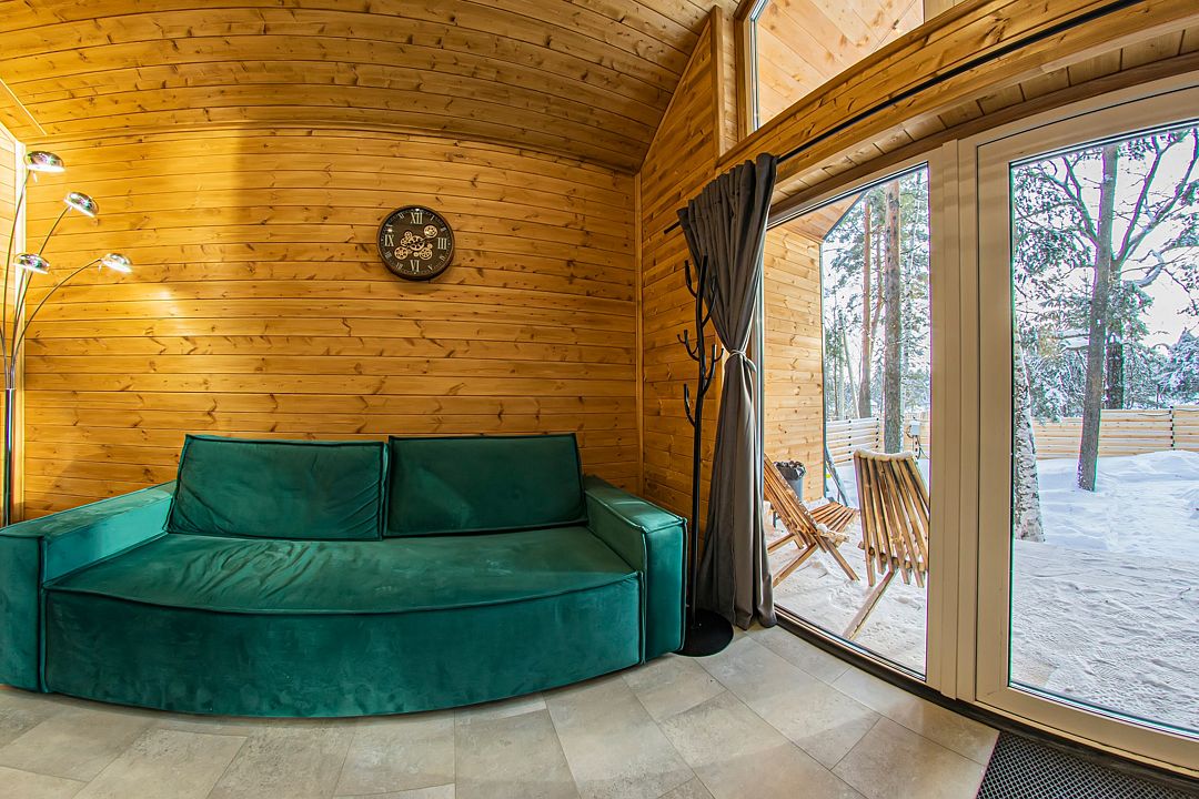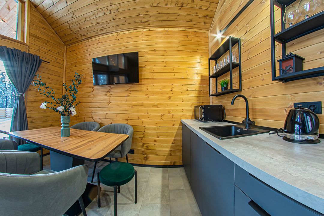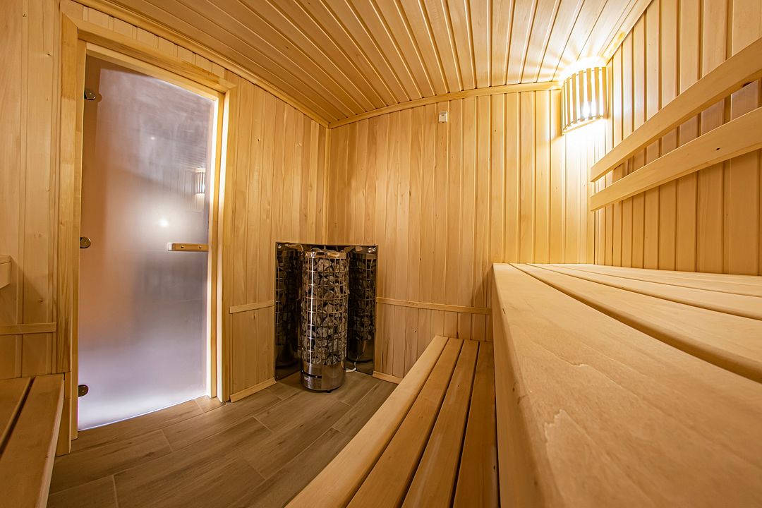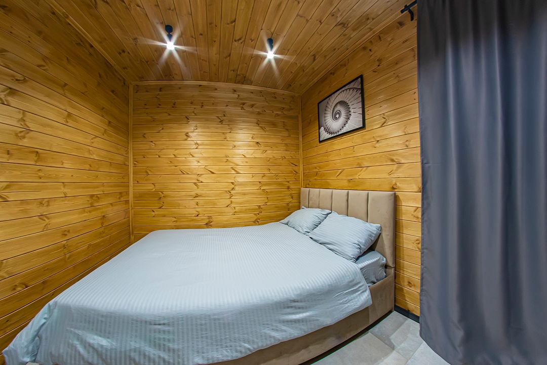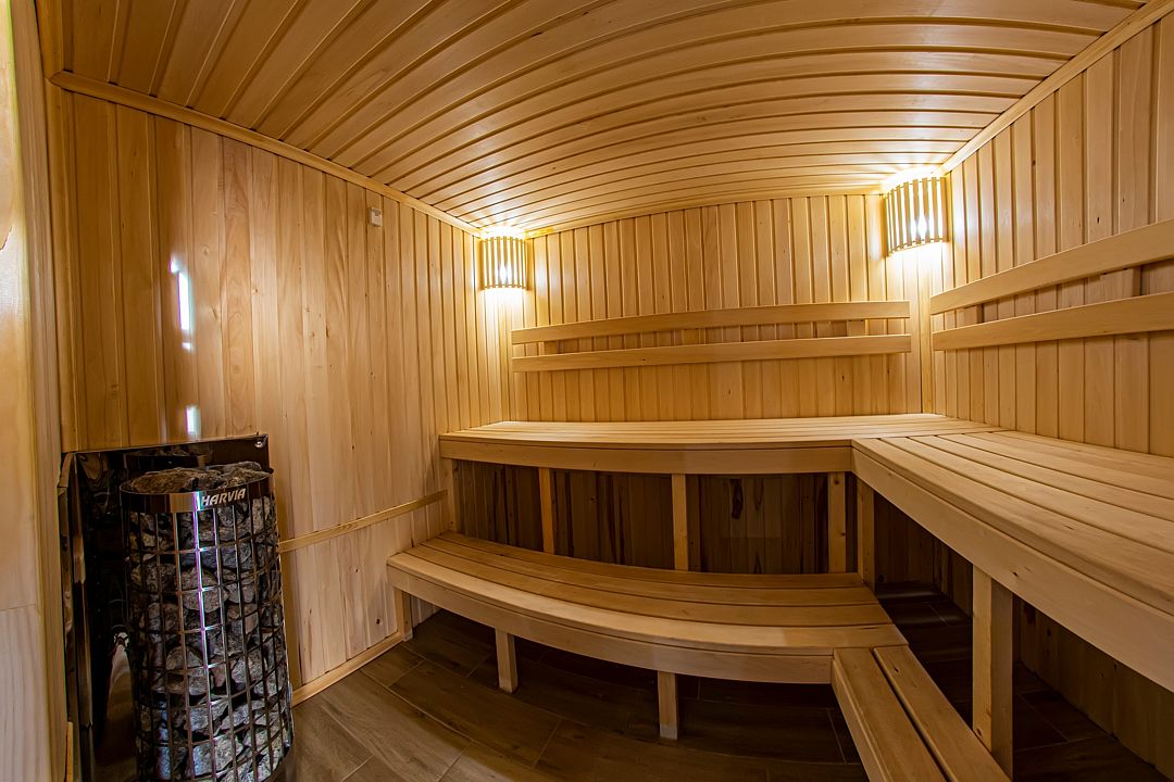а первом этаже есть спальная комната, оборудованная кухня и гостиная с обеденным столом для посиделок. А еще можно попариться в жаркой сауне.