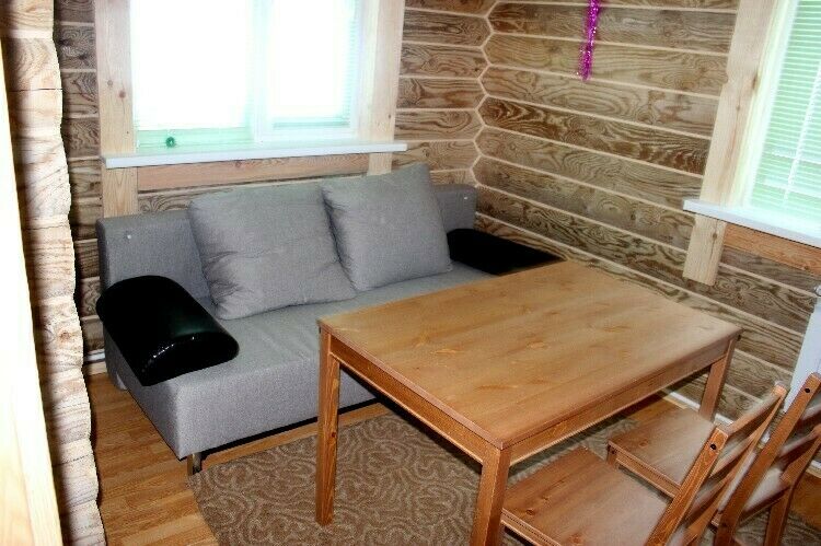 Большой раскладной диван, кухонный уголок, плита, СВЧ печь, посуда, холодильник. Телевизор с приемником транслирует более 100 каналов.