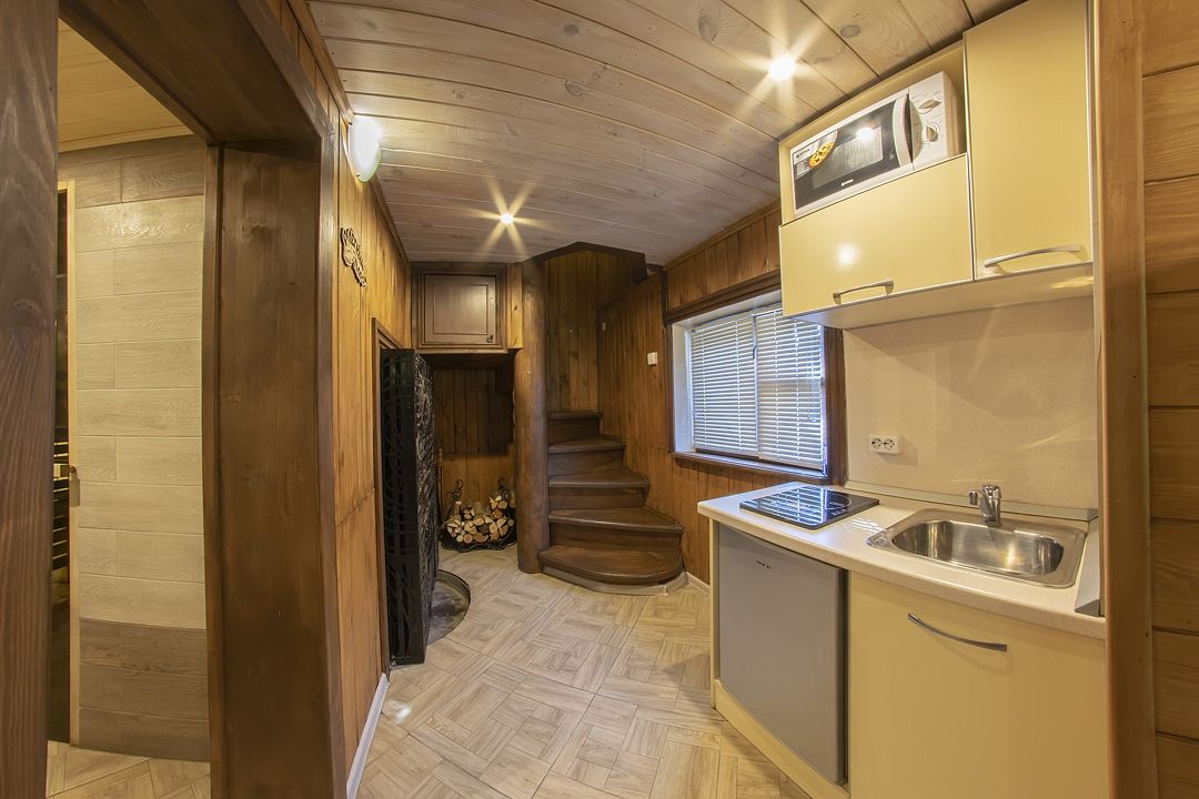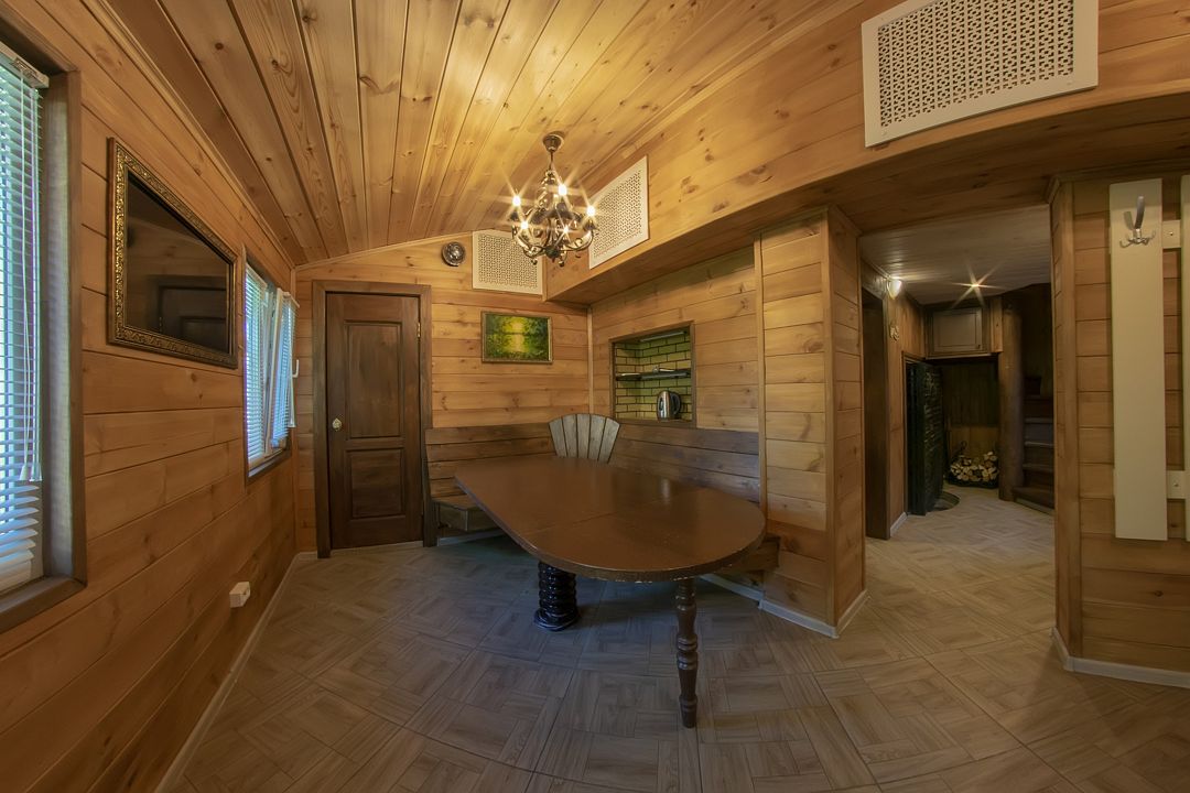 На первом этаже вас ждет настоящая русская баня на дровах с просторной парной, способной одновременно вместить до 10 человек, и контрастный душ «ведро-обливайка», который подарит вам незабываемые эмоции. Комфортный гостевой зал оснащен удобной мебелью и обеденным столом, где вы сможете провести время в приятной обстановке. В доме имеется вся необходимая бытовая техника, а также полный набор посуды для приготовления ваших любимых блюд. На втором этаже находится спальная зона с просторной двуспальной кроватью и раскладным диваном.