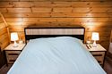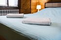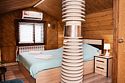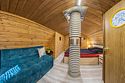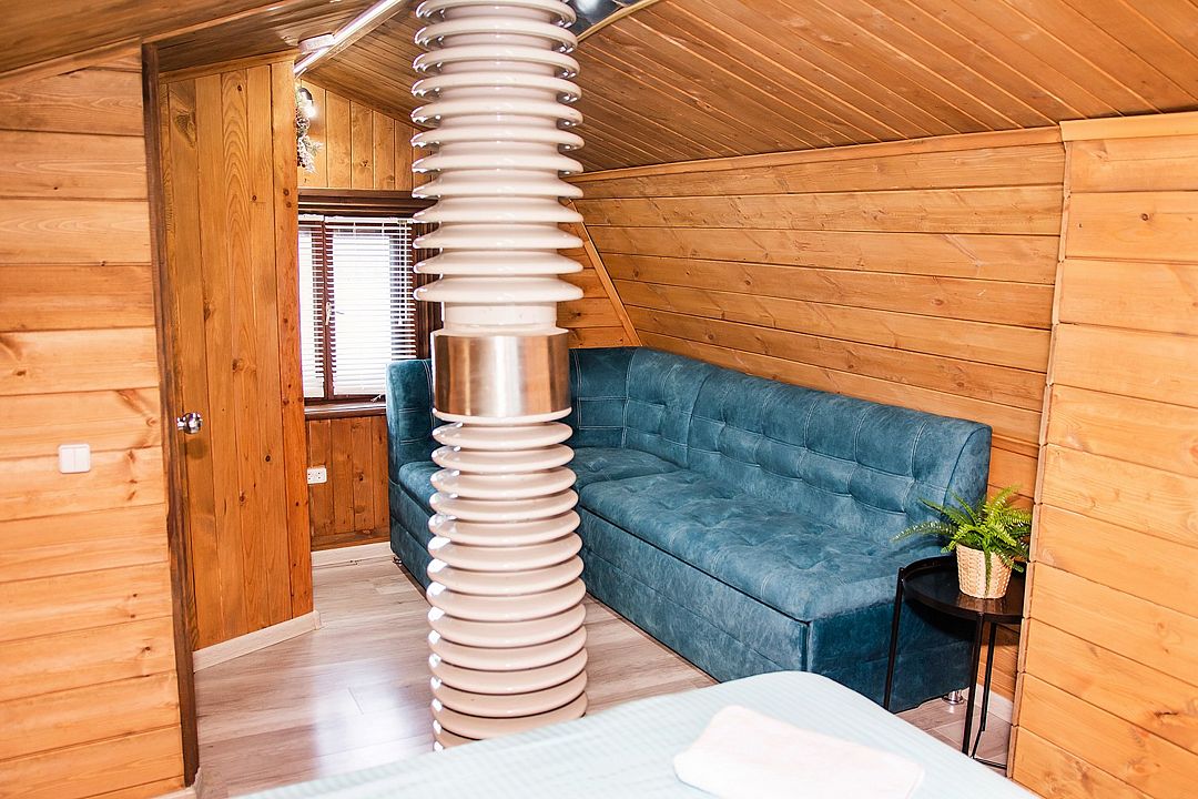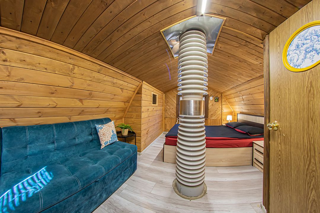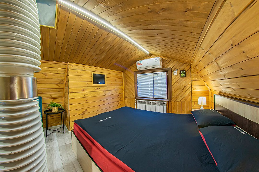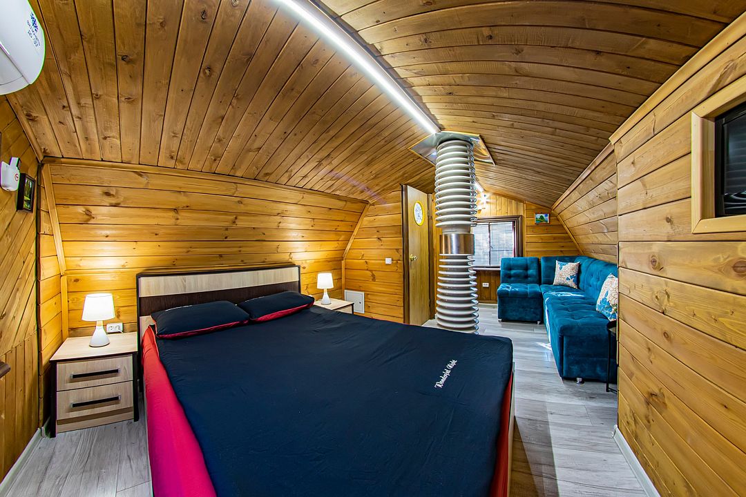 На первом этаже также расположен гостевой зал с обеденной зоной и полностью оборудованная кухня. Второй этаж занимает просторная спальная зона с двуспальной кроватью и раскладным диваном.