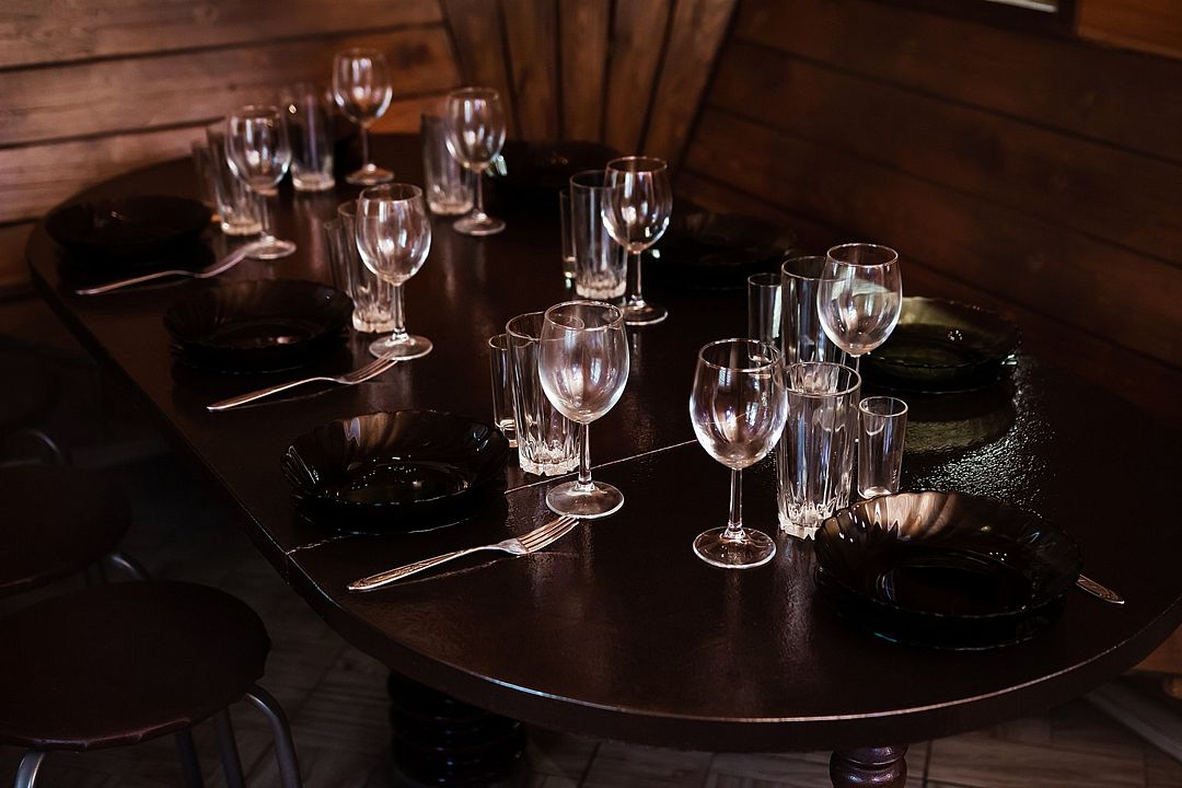 - набор посуды на 6 человек (глубокие тарелки, плоские тарелки, кружки для чая, бокалы под сок, рюмки, фужеры, ложки, вилки и ножи);