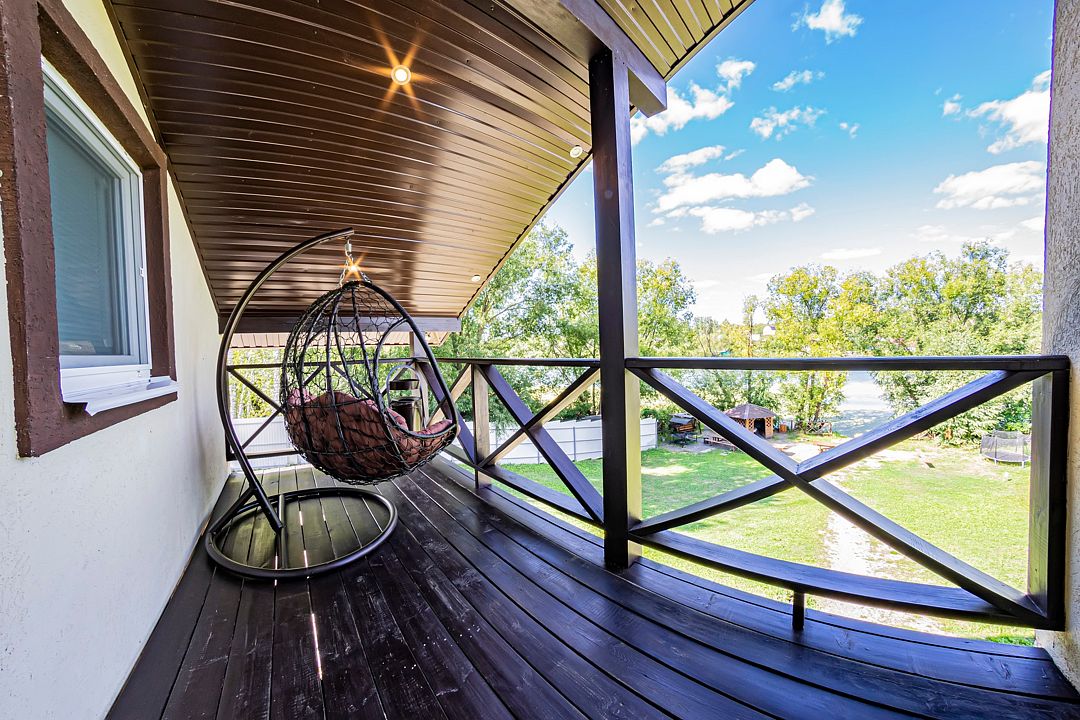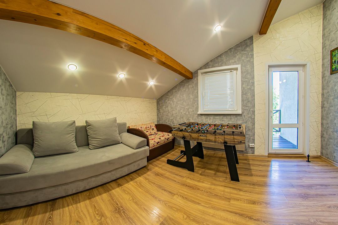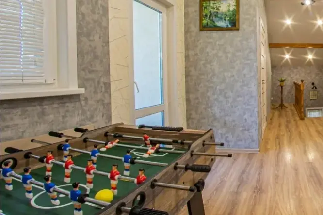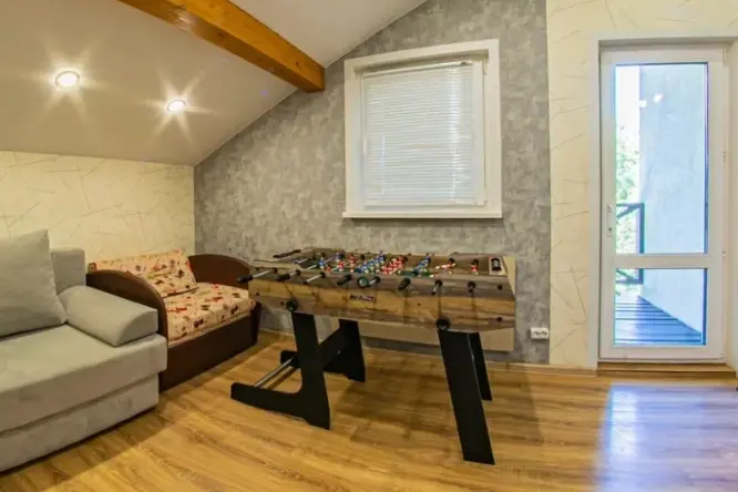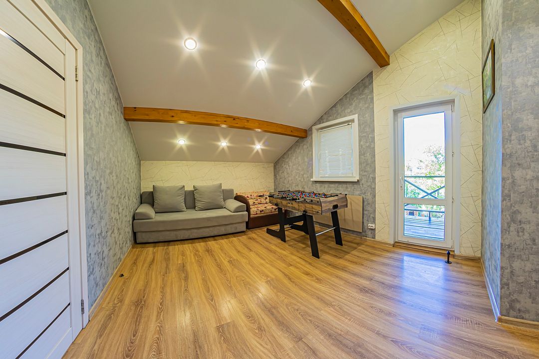 На втором этаже расположены три спальни и холл с настольным футболом. С балкона открывается великолепный вид на озеро.