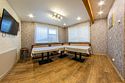 На первом этаже вы найдете жаркую сауну, полностью оборудованную кухню с необходимой техникой и посудой, уютную гостиную с камином и массажным креслом, а также просторную столовую зону с большим обеденным столом. Кроме того, здесь установлена светомузыка со стробоскопом, мощная стереосистема и караоке для веселых посиделок.