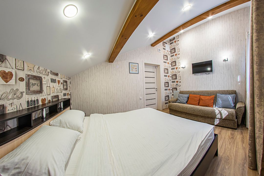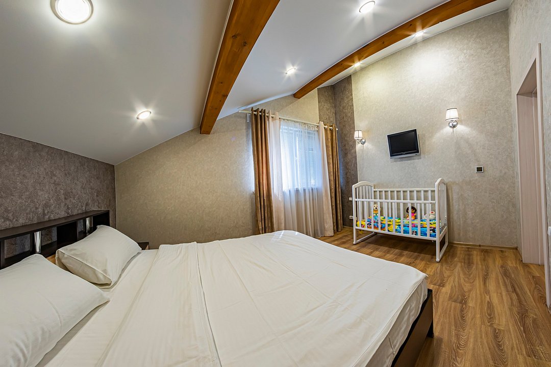 - 10 спальных мест (3 отдельные комнаты с двуспальными кроватями на 2 этаже, в одной из них есть раскладной диван, и диван в гостиной на втором этаже);