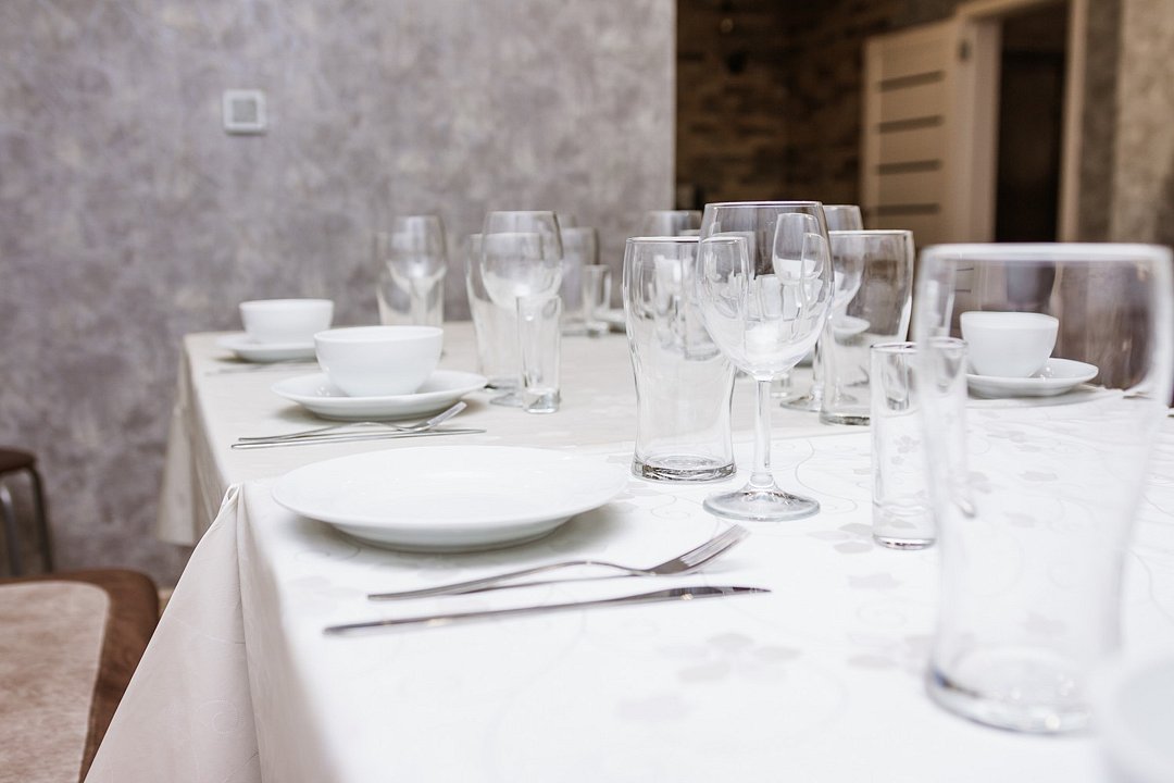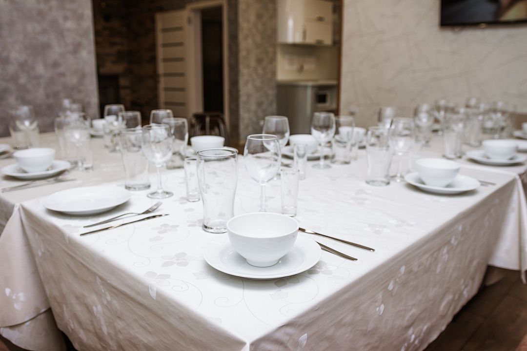 - набор посуды на 15 человек (глубокие тарелки, плоские тарелки, кружки для чая, бокалы под сок, рюмки, фужеры, ложки, вилки и ножи);