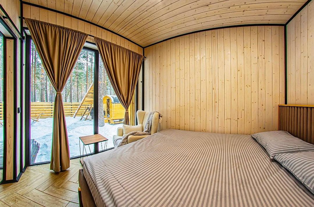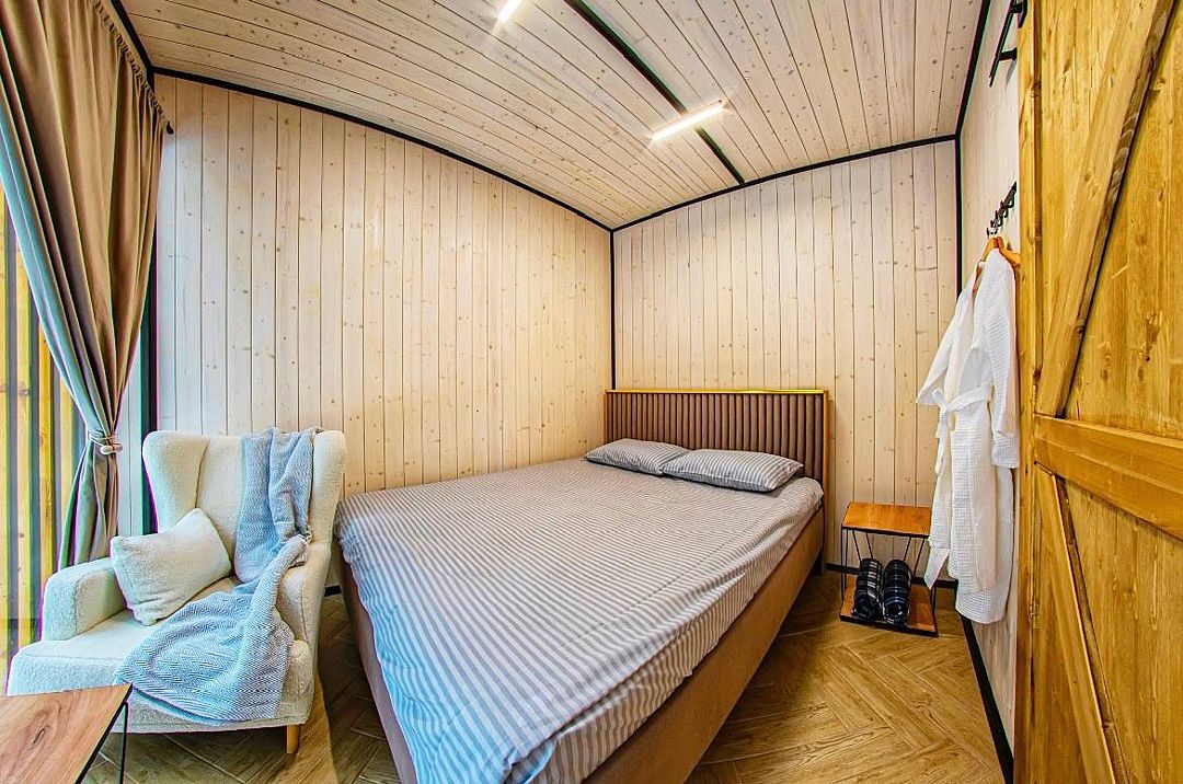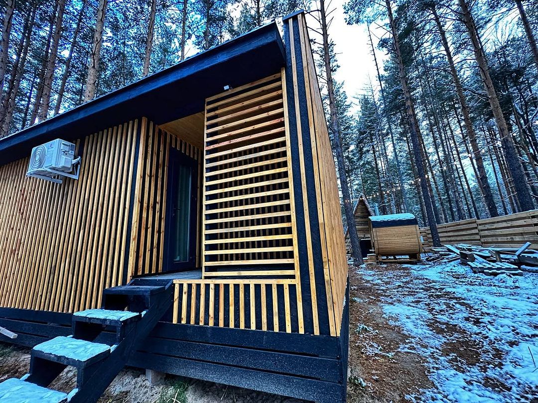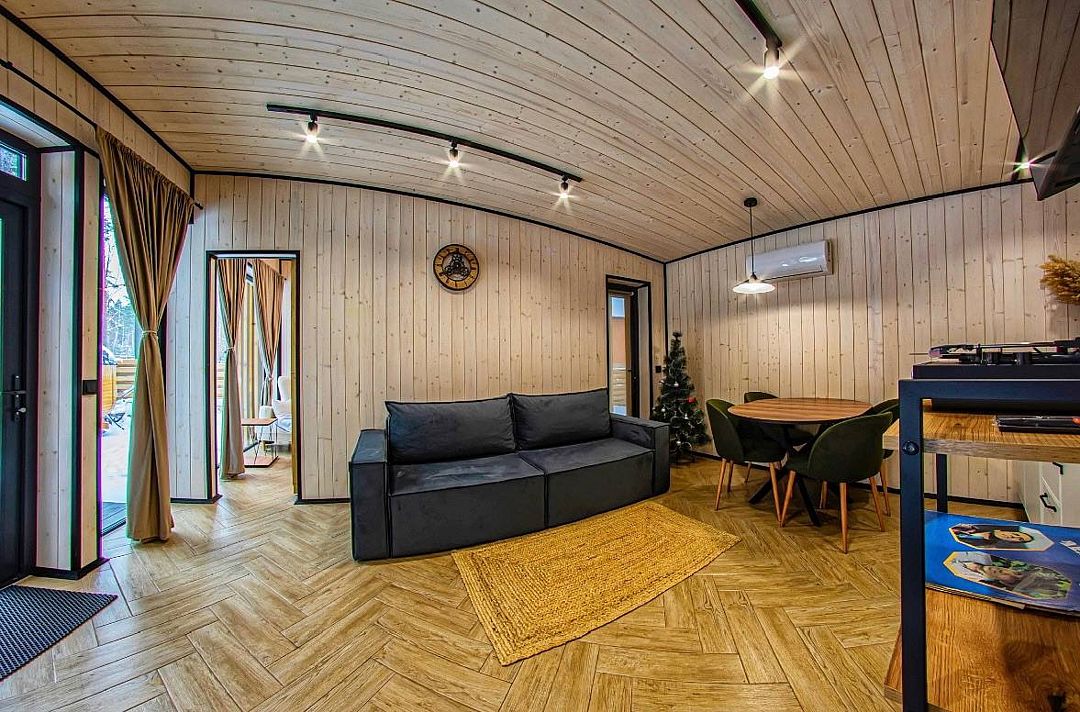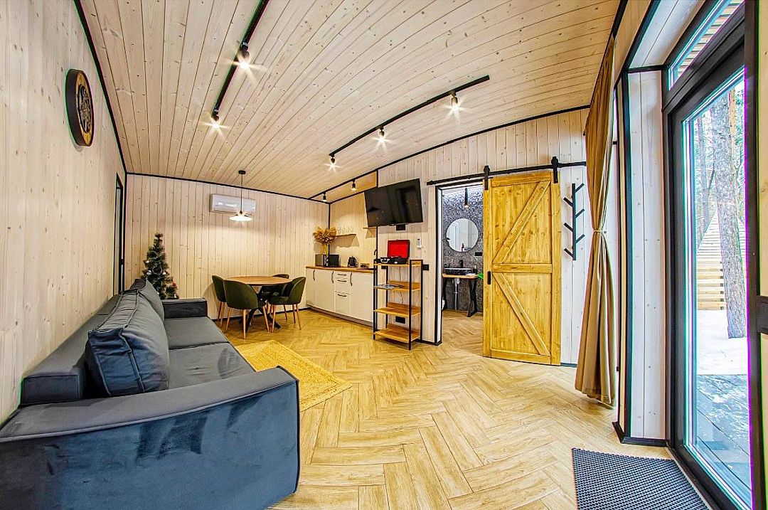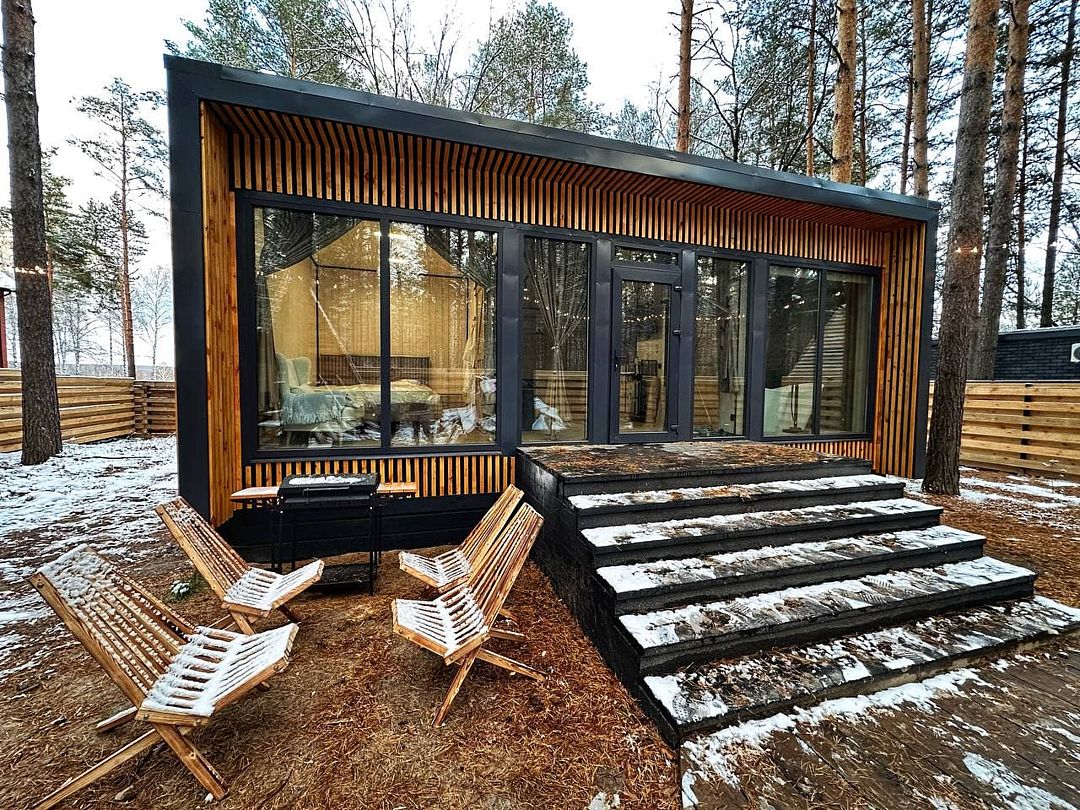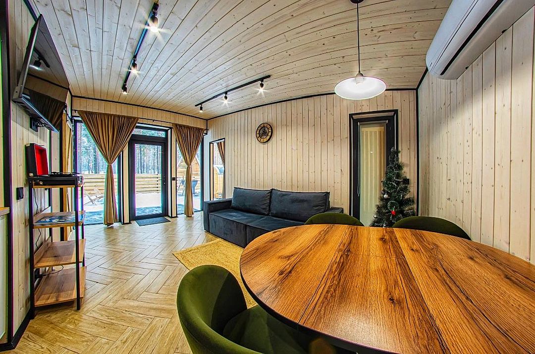 Уютный и абсолютно новый домик с потрясающим видом на сосновый лес. При желании можно задернуть шторы и погрузиться в атмосферу уединения и спокойствия. На первом этаже есть спальная комната, оборудованная кухня и гостиная с обеденным столом.