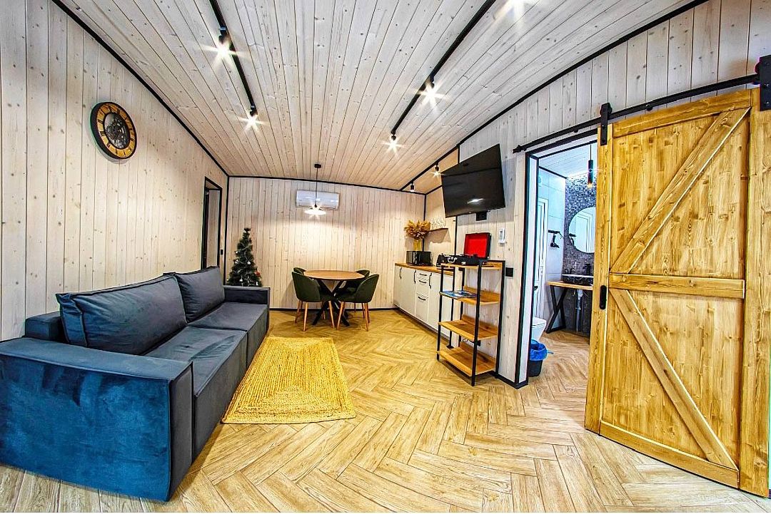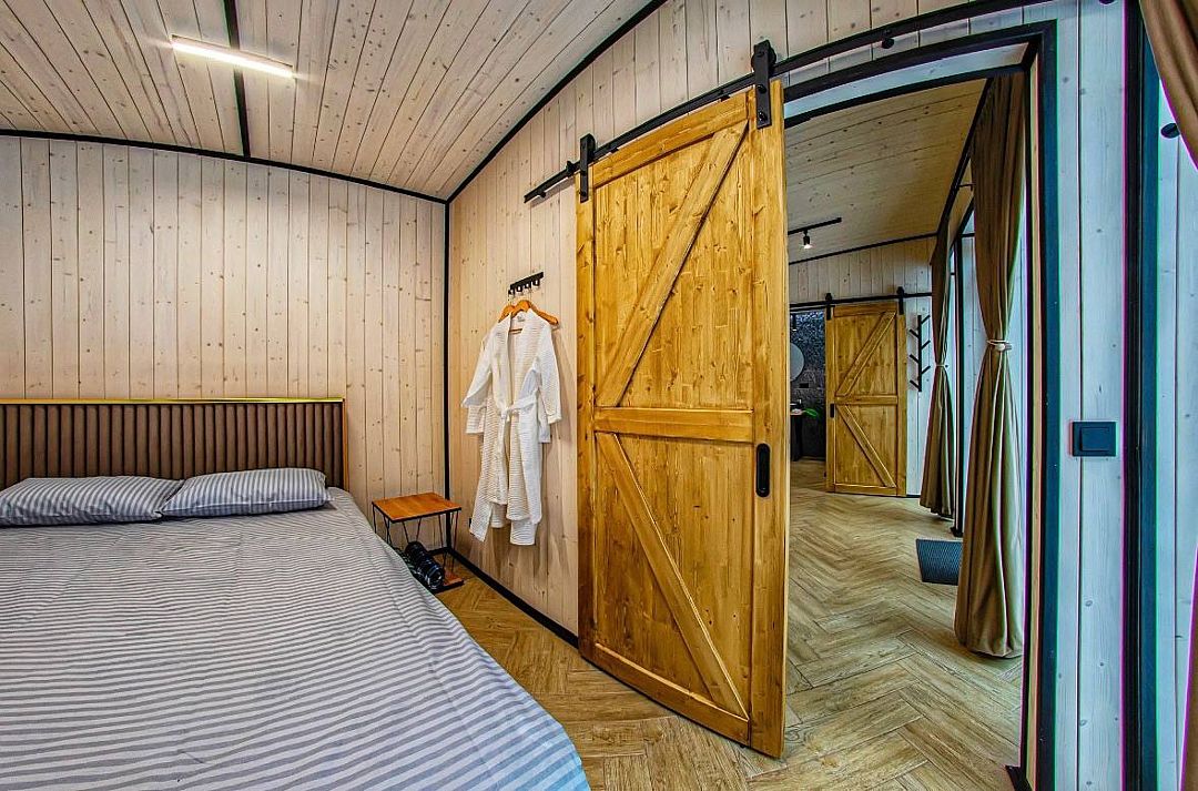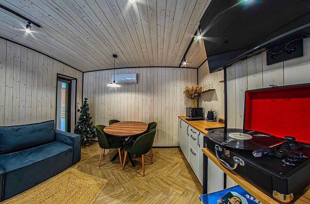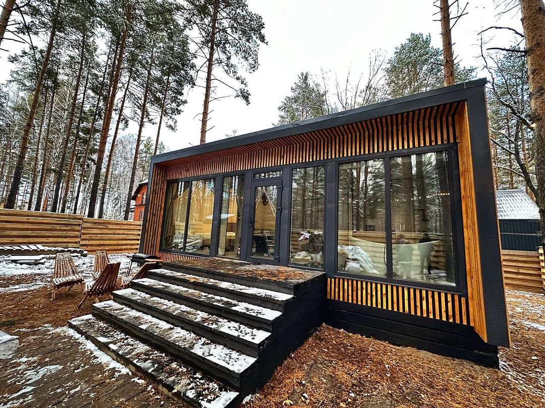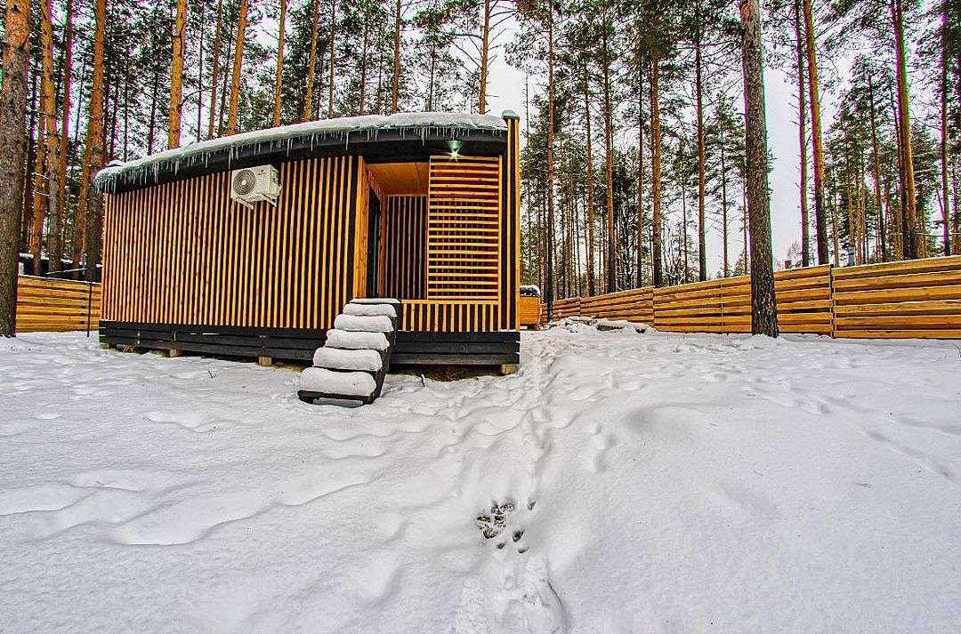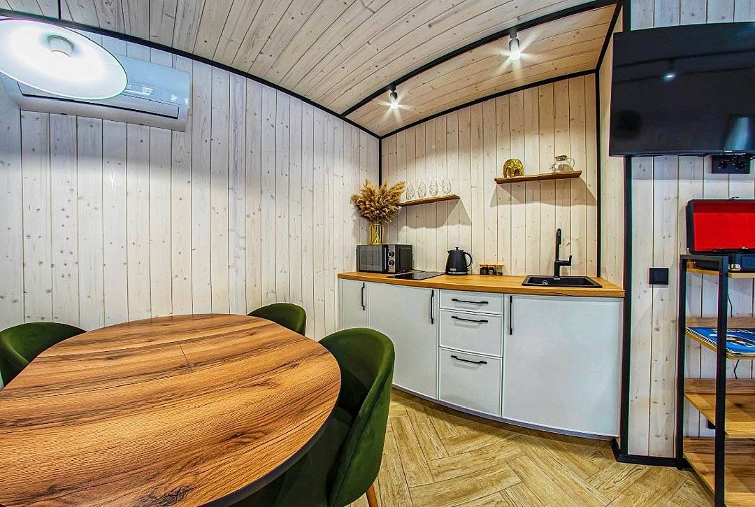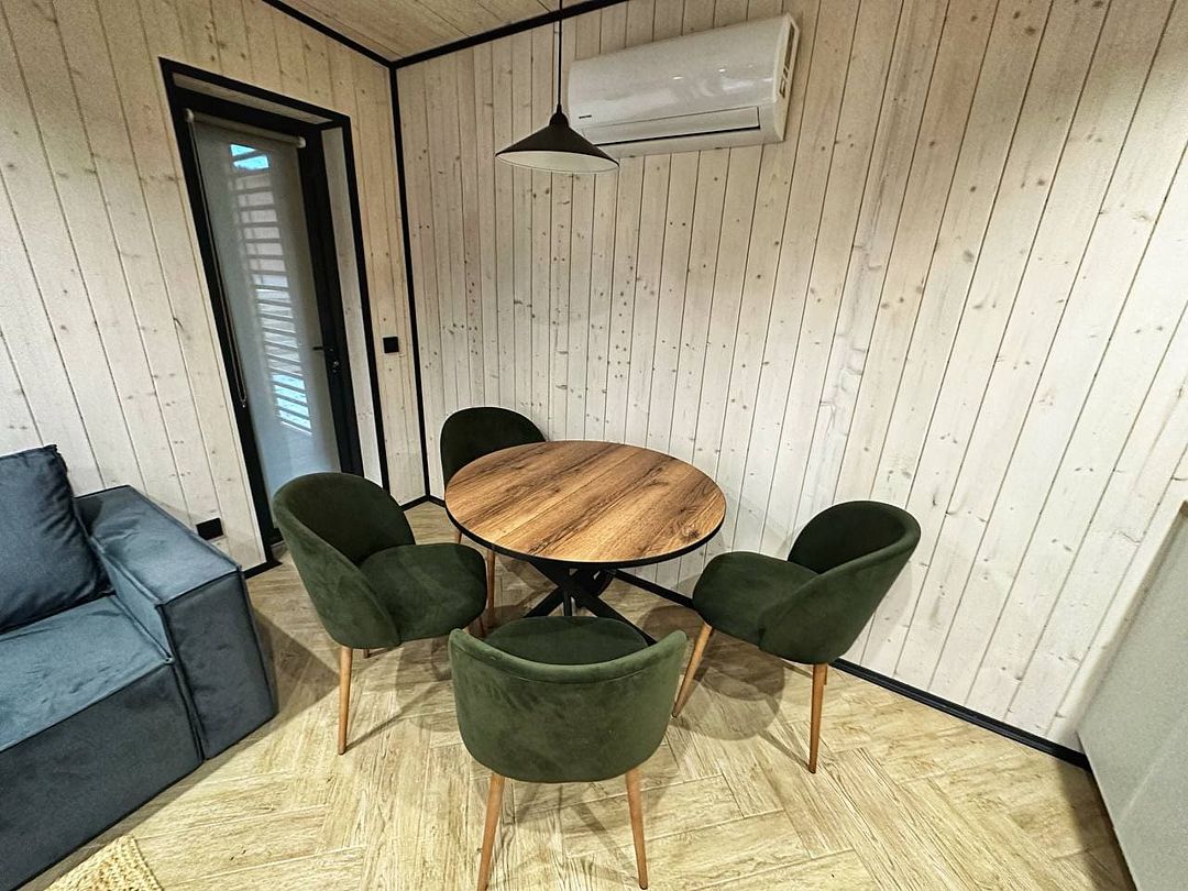 Уютный и абсолютно новый домик с потрясающим видом на сосновый лес. При желании можно задернуть шторы и погрузиться в атмосферу уединения и спокойствия. На первом этаже есть спальная комната, оборудованная кухня и гостиная с обеденным столом.
