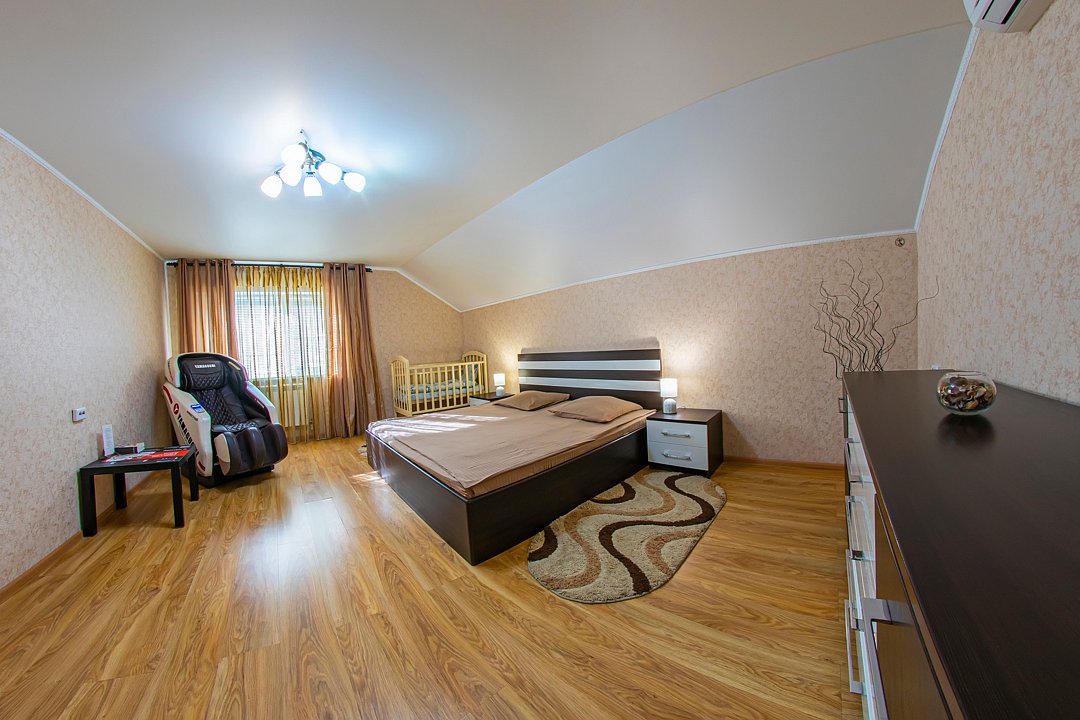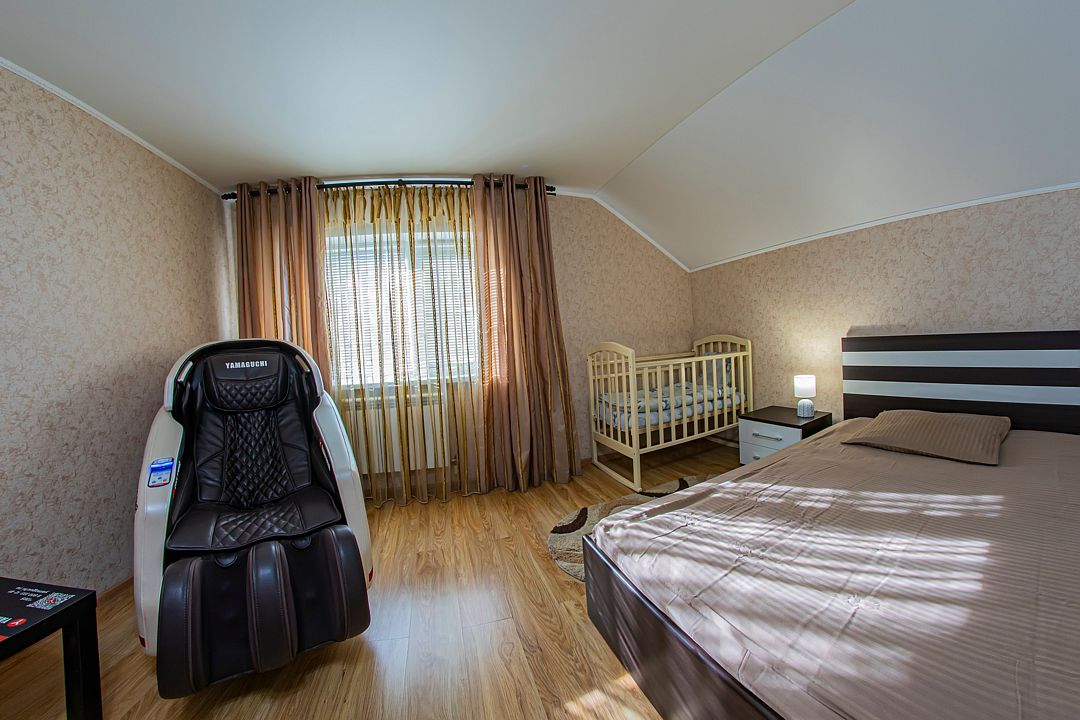 На втором этаже — игровая комната и две спальни, одна из которых оборудована детской кроваткой и массажным креслом.