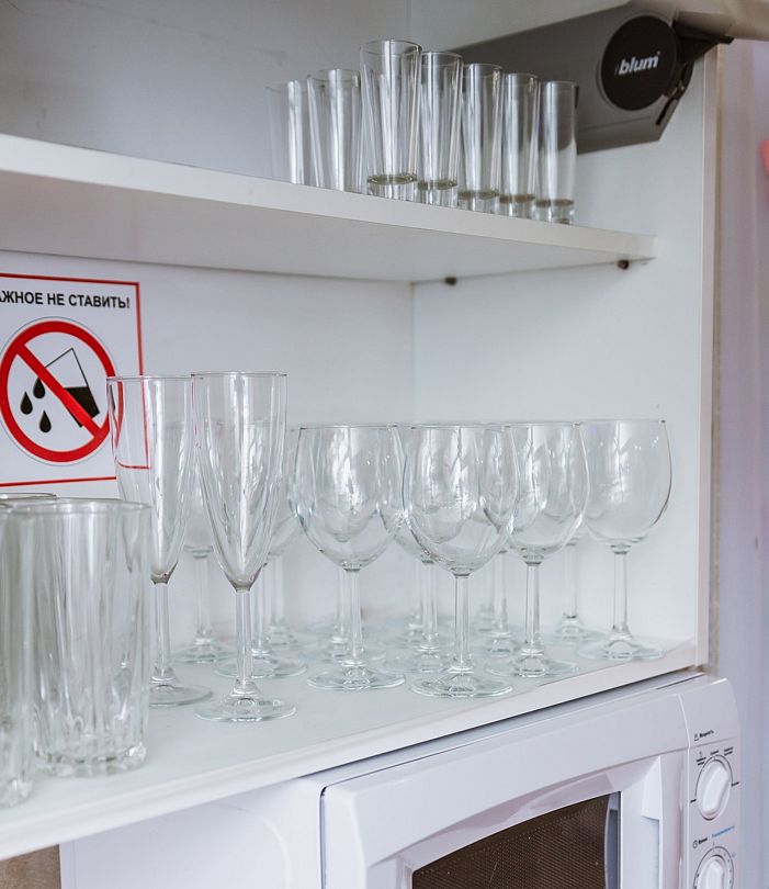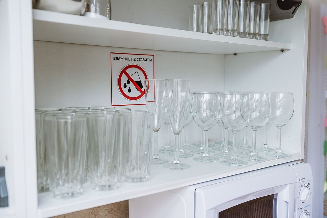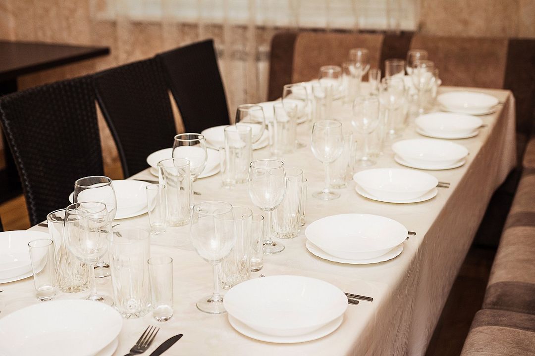 - набор посуды на 15 человек (глубокие тарелки, плоские тарелки, кружки для чая, бокалы под сок, рюмки, фужеры, ложки, вилки и ножи);