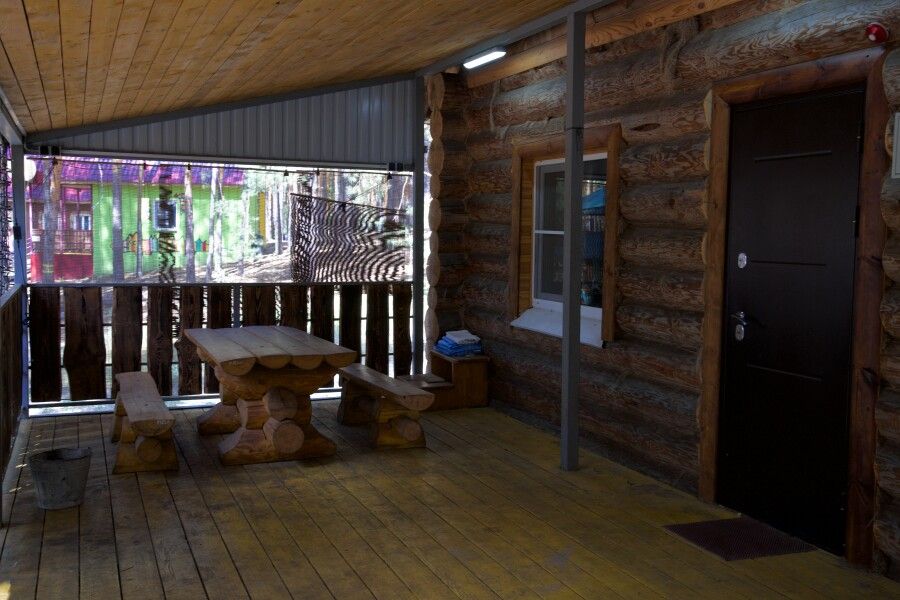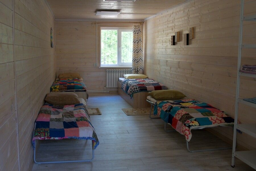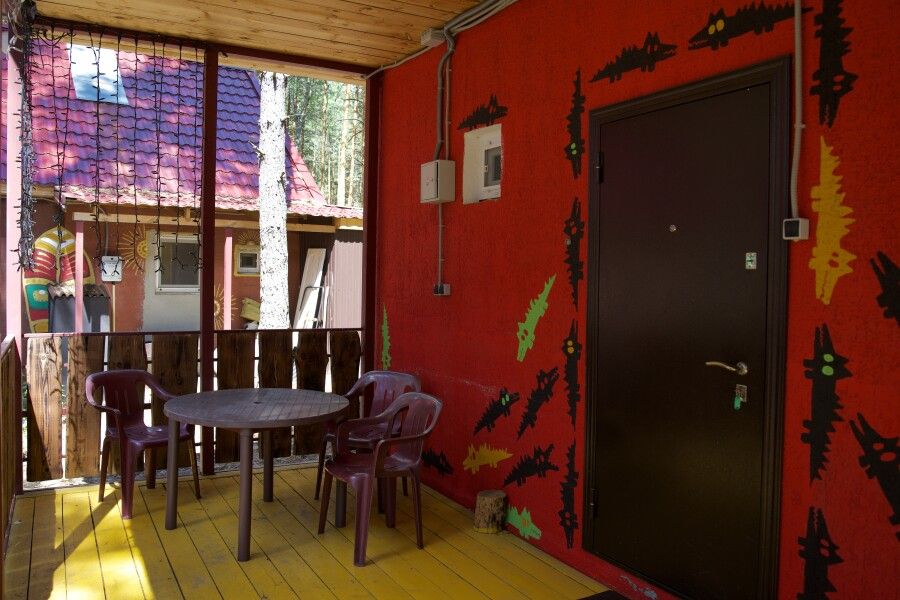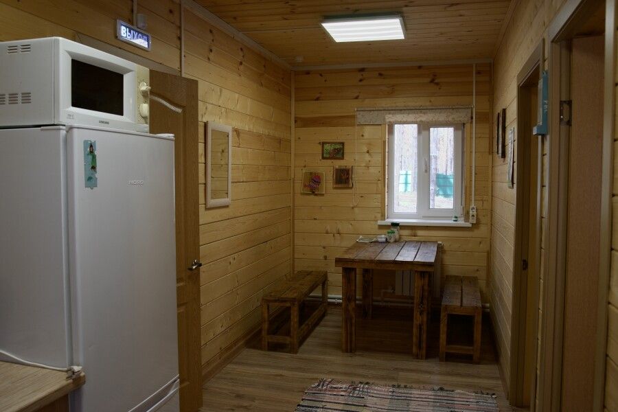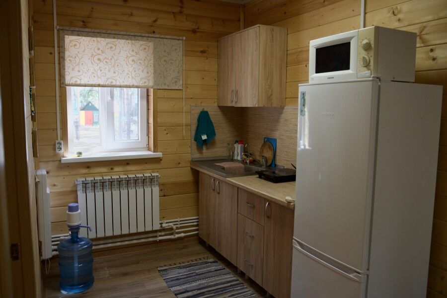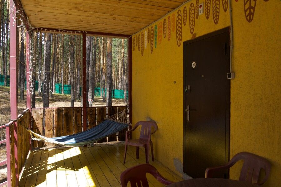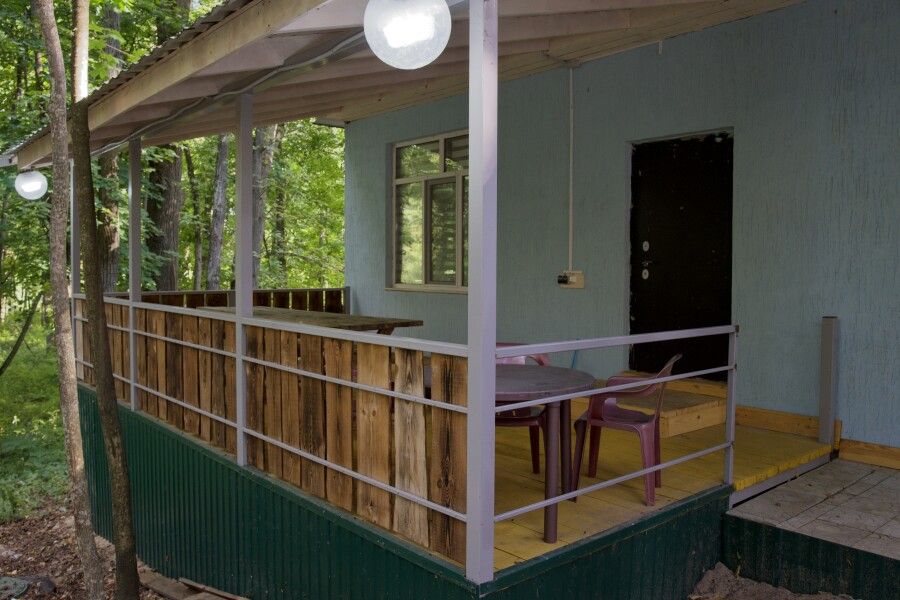 Дом на две комнаты по два человека. Кухня: холодильник, чайник, духовка, плитка, посуда. Есть раздельные санузел и душ. К дому примыкает большая веранда.