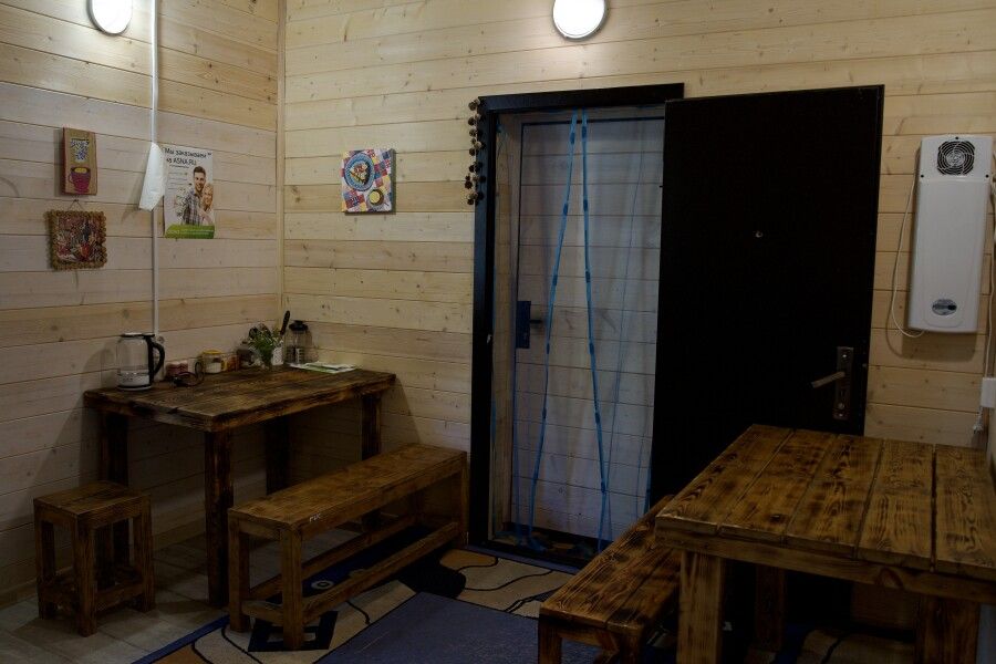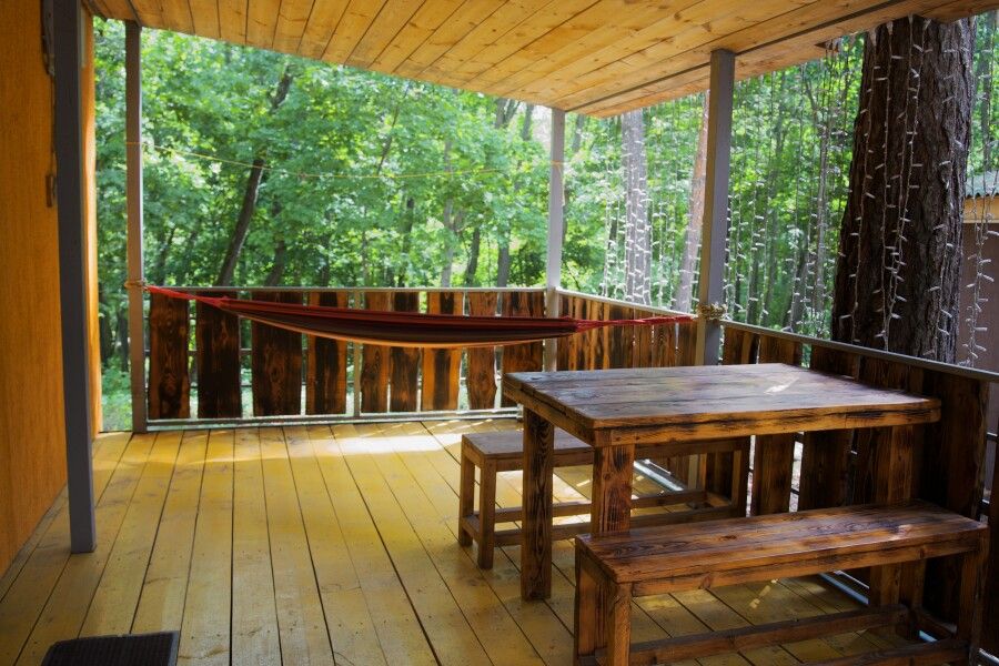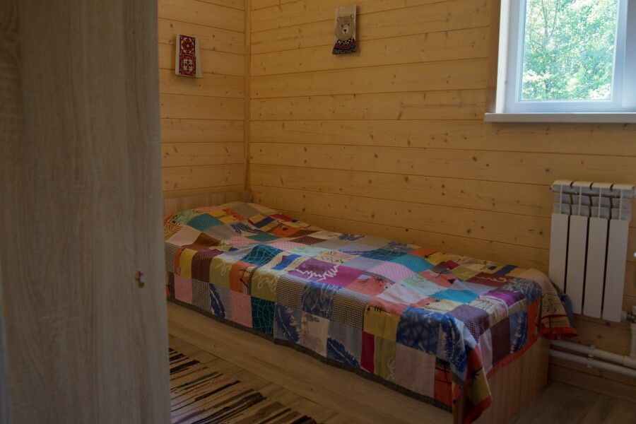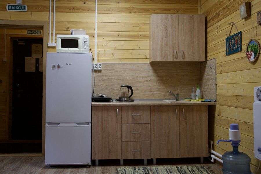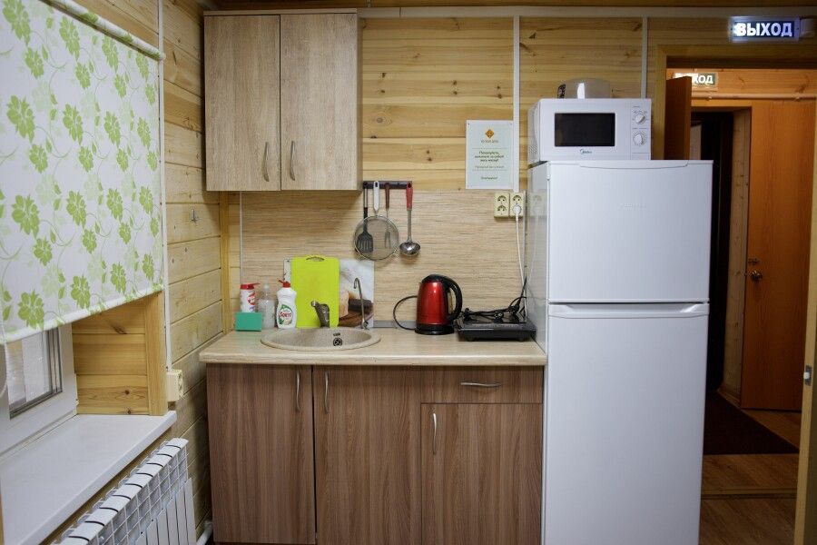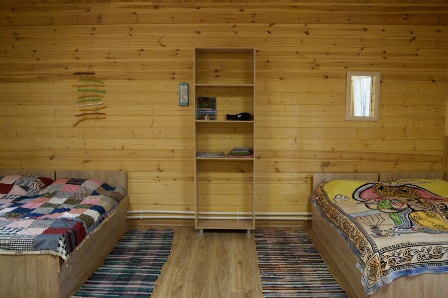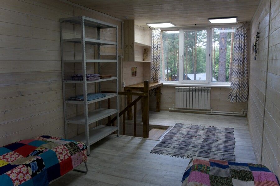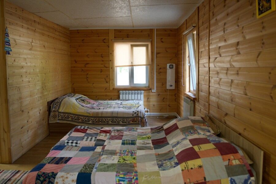 Дом на две комнаты по два человека. Кухня: холодильник, чайник, духовка, плитка, посуда. Есть раздельные санузел и душ. К дому примыкает большая веранда.