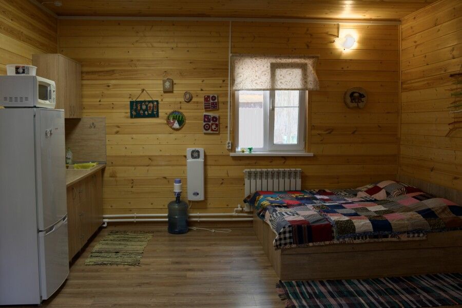 Дом-студия на восемь человек. Четыре двуспальные кровати. Есть кухня (чайник, плитка, набор посуды, холодильник, микроволновка), туалет, душ, горячая вода.