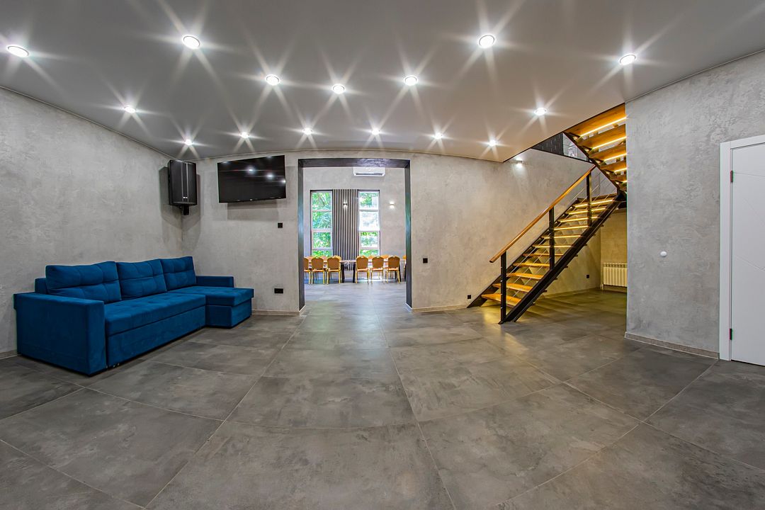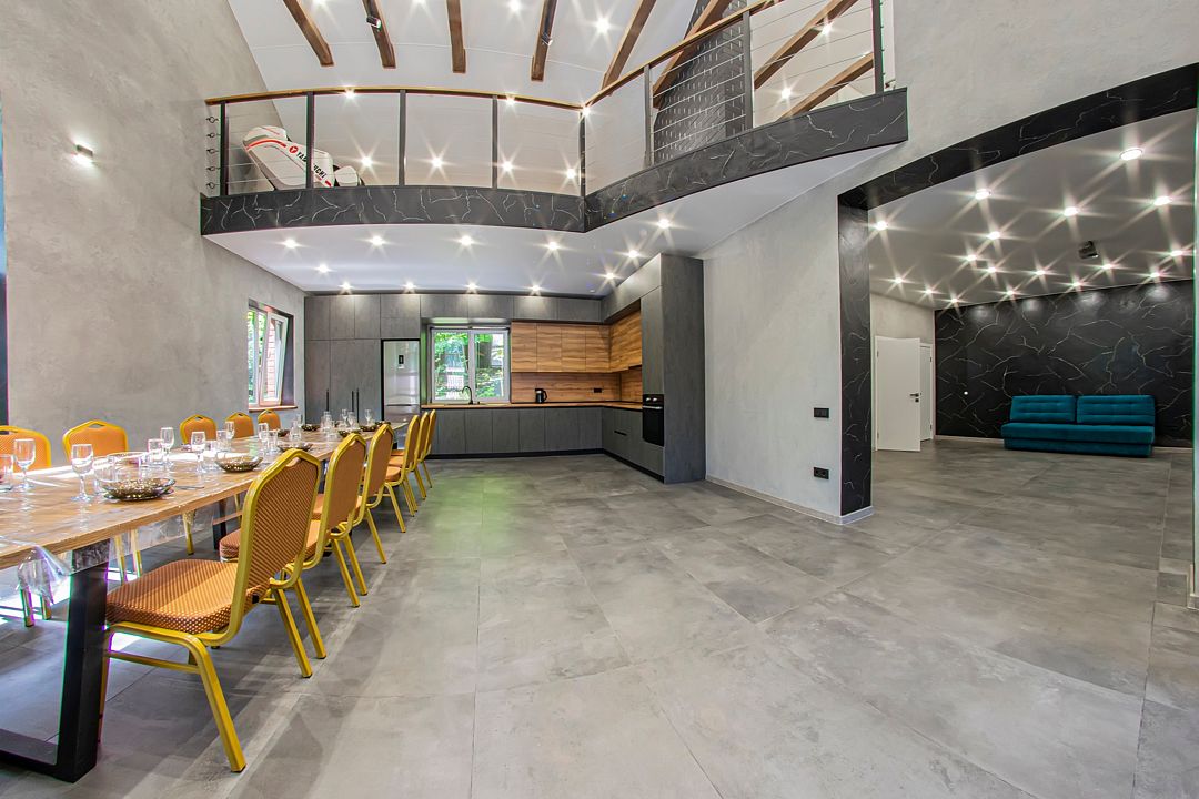 Первый этаж включает просторную банкетную зону с кухней, танцпол и зону отдыха с сауной и бассейном.