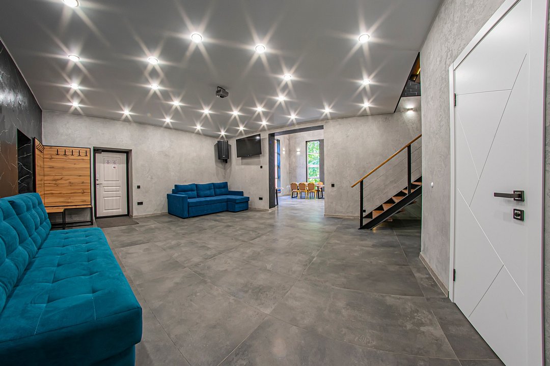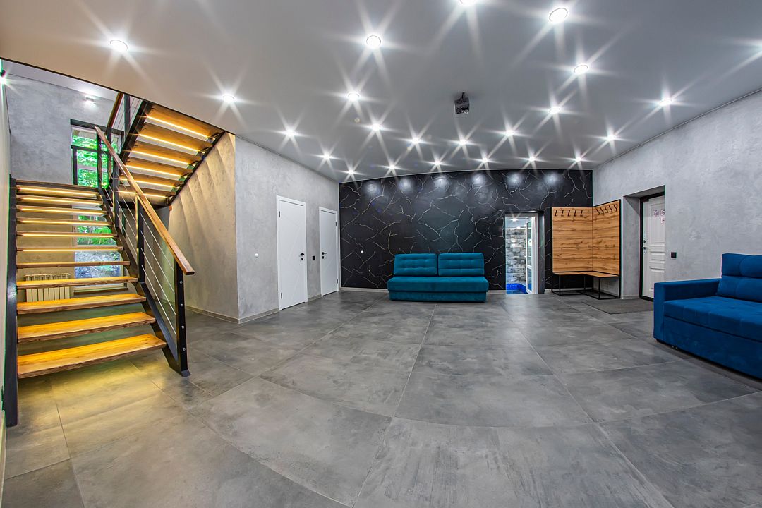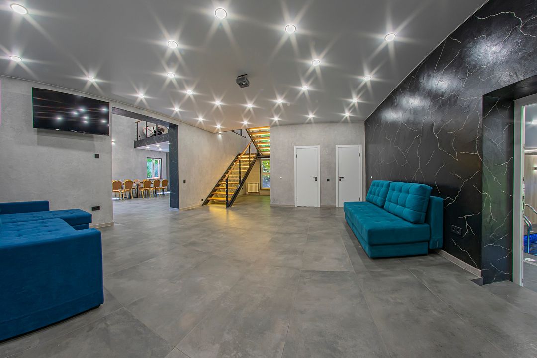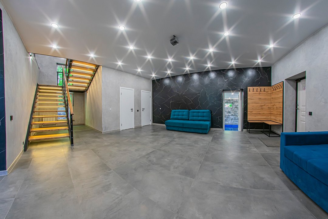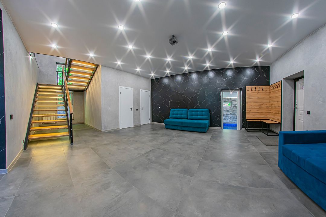 На первом этаже есть просторная банкетная зона с кухней, танцпол и сауна с бассейном. Длина бассейна 4,5 м*3,5 м, глубина 1,7м. На втором этаже расположены спальни, а также зона для релакса с массажным креслом и огромным диваном.