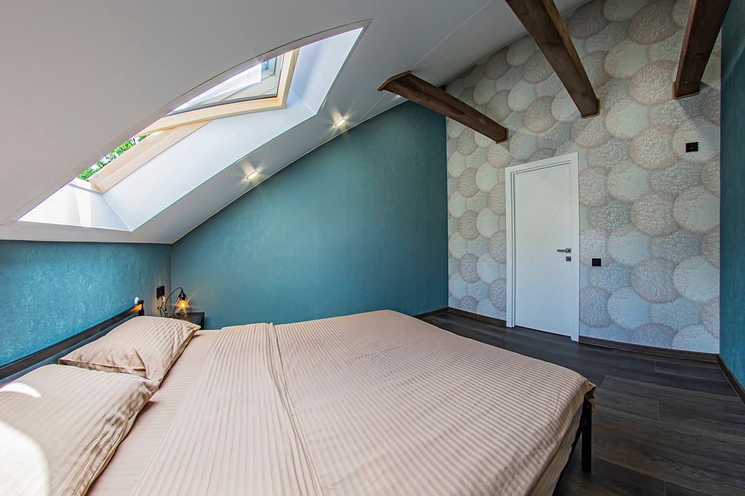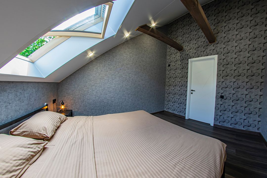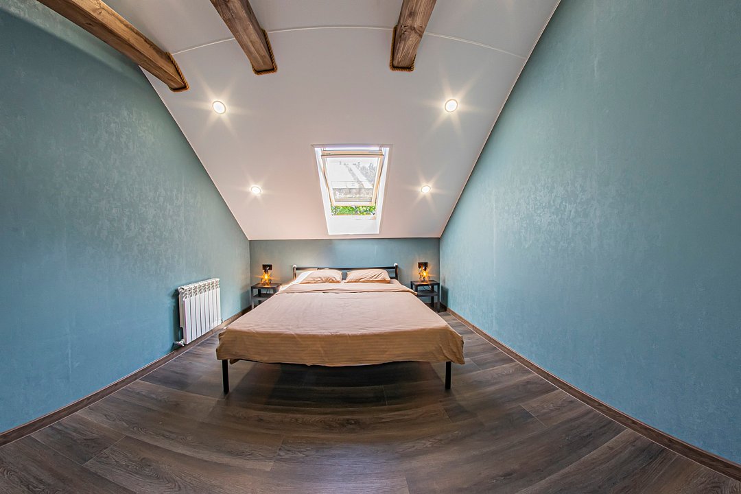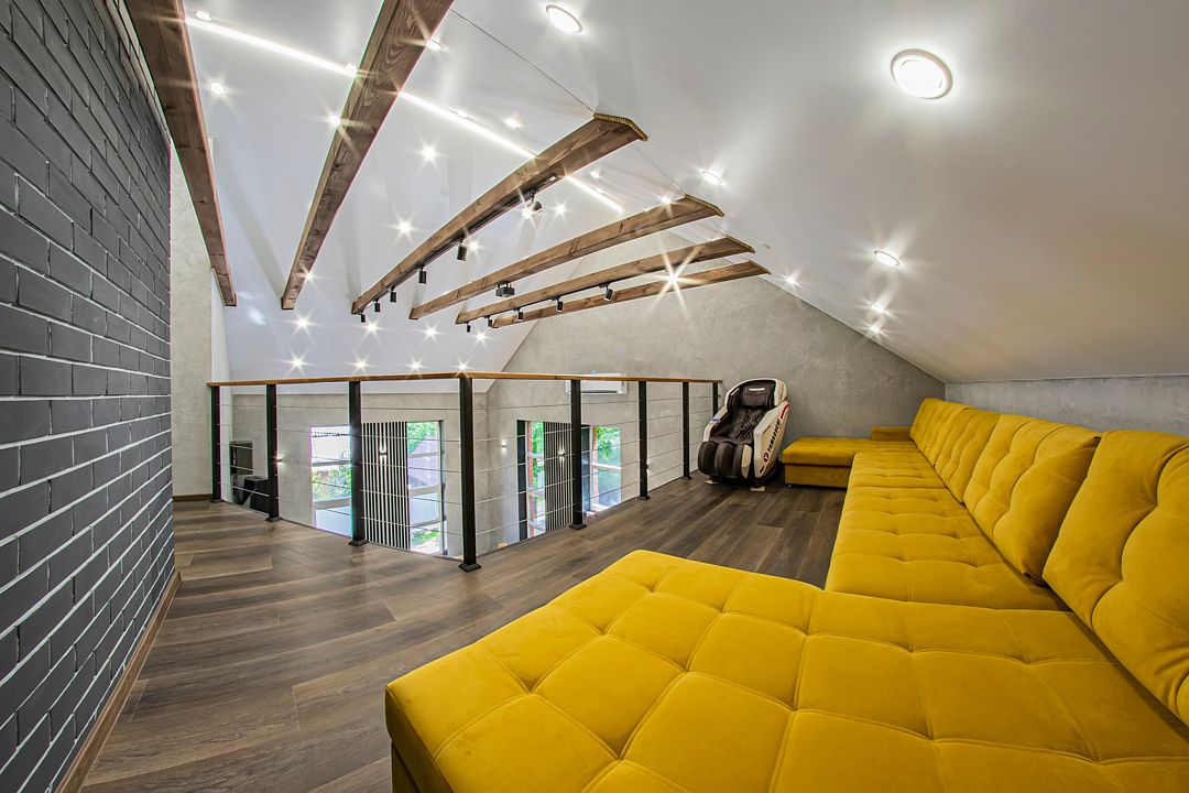 На втором этаже расположены спальни и уютная зона отдыха с массажным креслом и большим диваном.