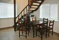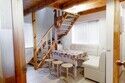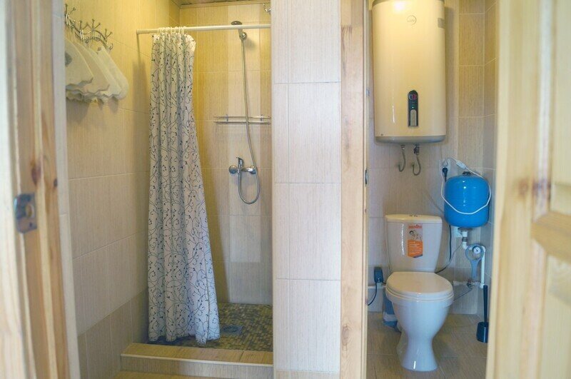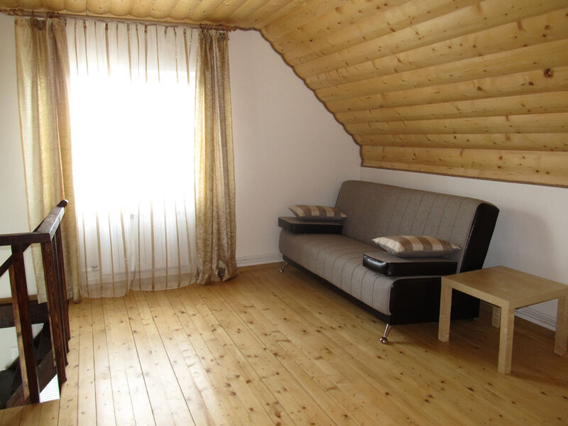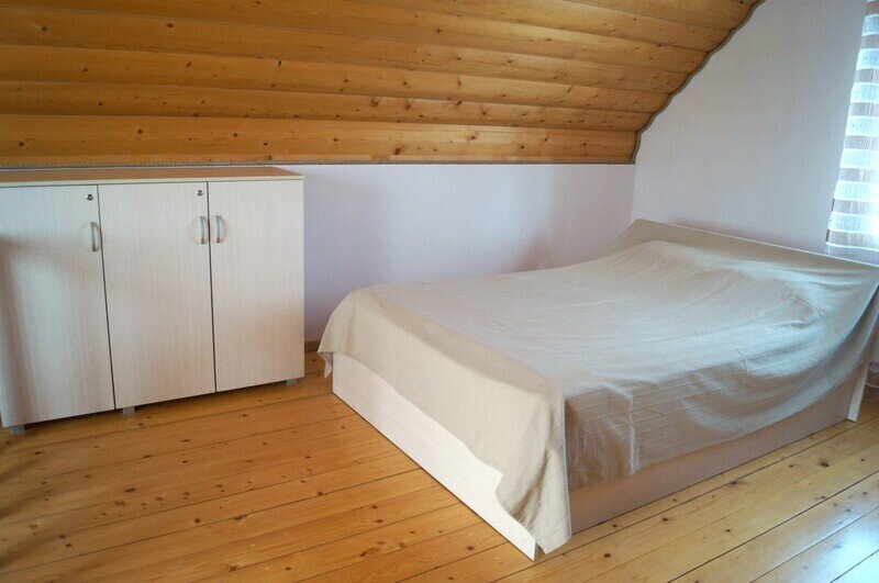 На первом этаже расположена гостиная, веранда, ванная комната, баня на дровах и выход к пруду. Так же стоит отметить наличие мини-кухни со всеми необходимыми столовыми приборами и посудой. На втором этаже находится спальная комната с двумя кроватями и диваном.