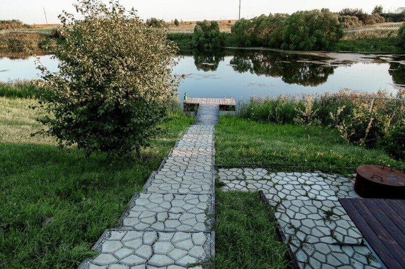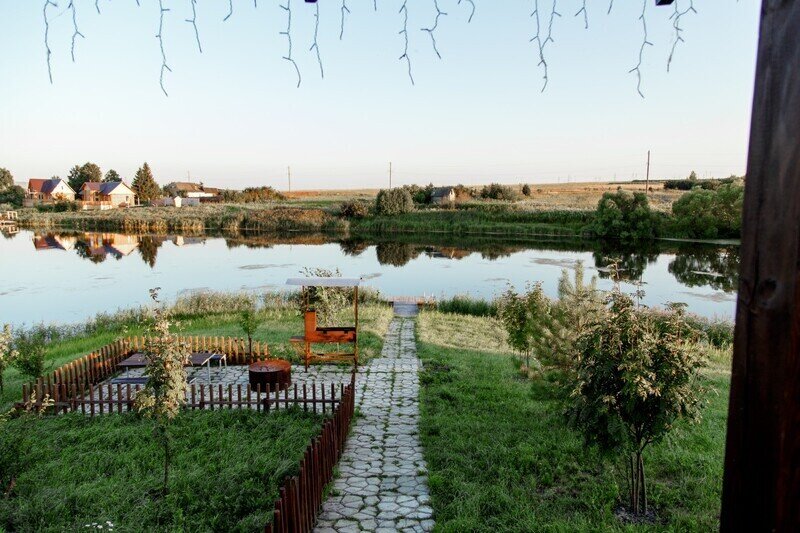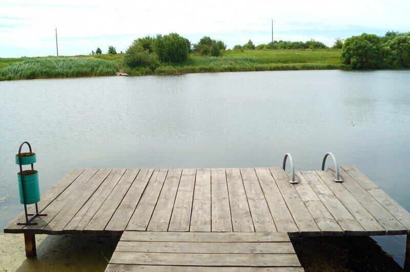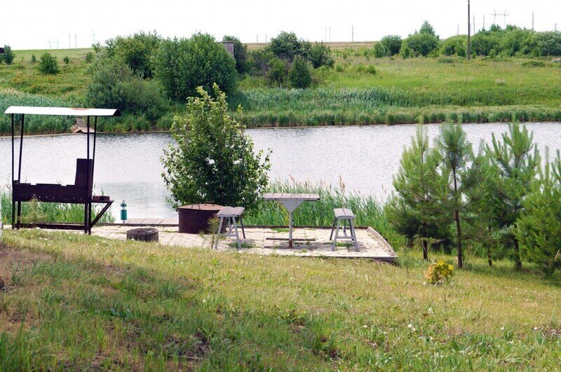 На прилегающей территории расположены лавки и столы, очаг для приготовления еды и место для ловли рыбы и купания.