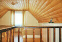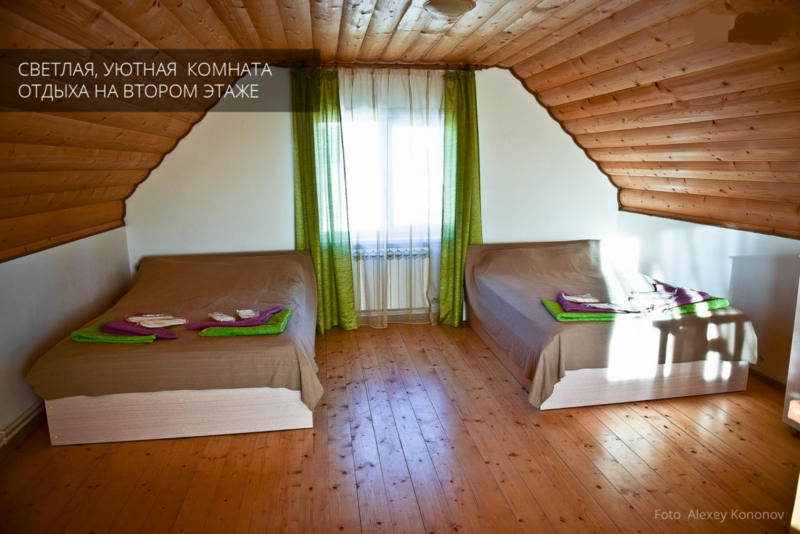 2-этажный коттедж удален от основных зданий и других домов. На первом этаже расположены основные помещения типа гостиной, мини-кухни, ванной комнаты, бани и веранды с выходом в пруд. На втором этаже расположена спальня с двумя кроватями.