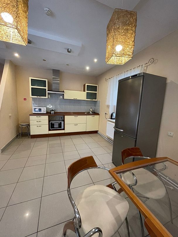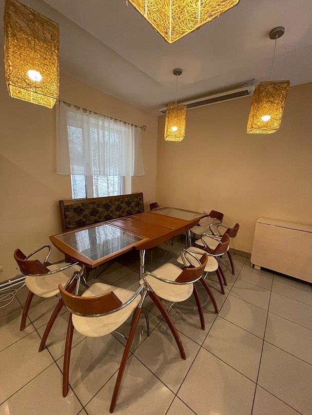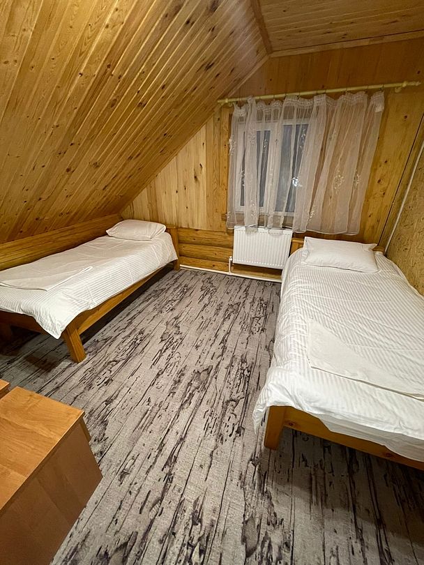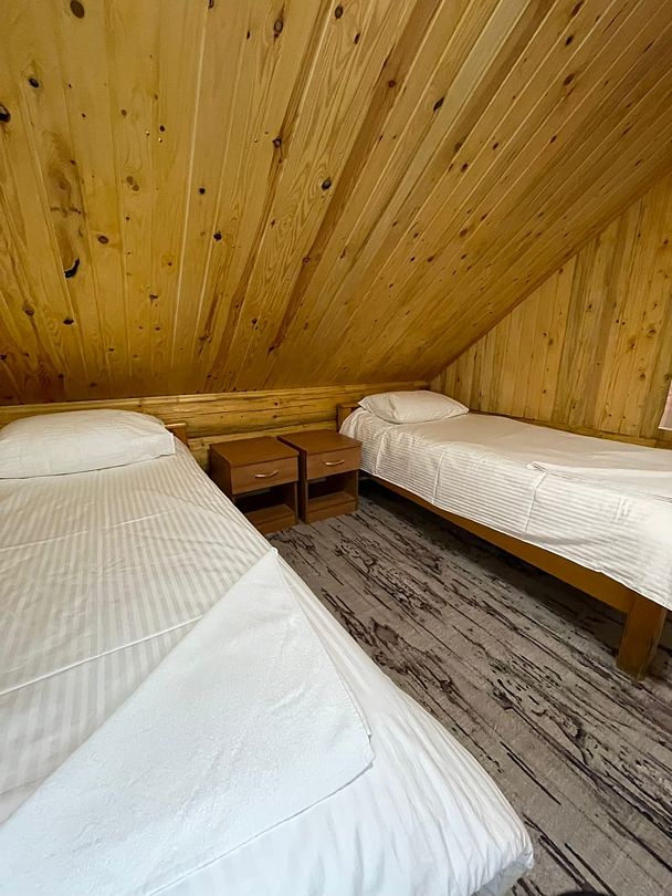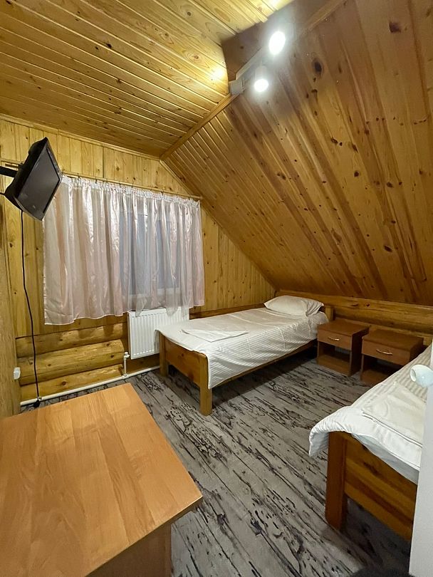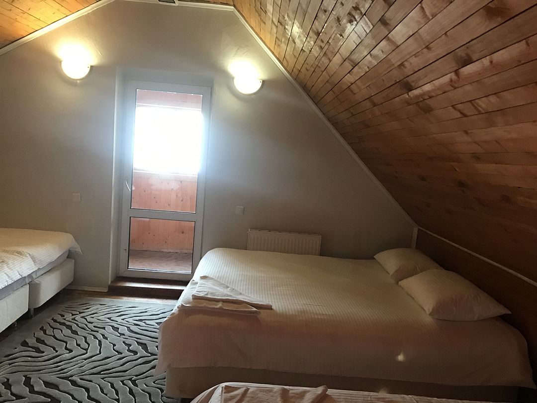 Трехэтажный коттедж. Просторная гостиная с камином, 5 комнат, двухуровневые кровати, бильярдный стол, кухня, 1 санузел с душевой, 1 санузел.