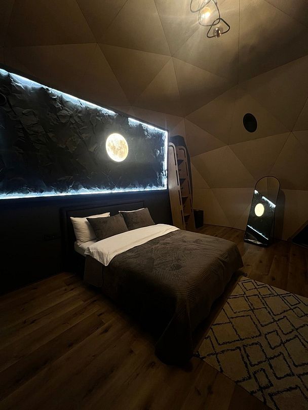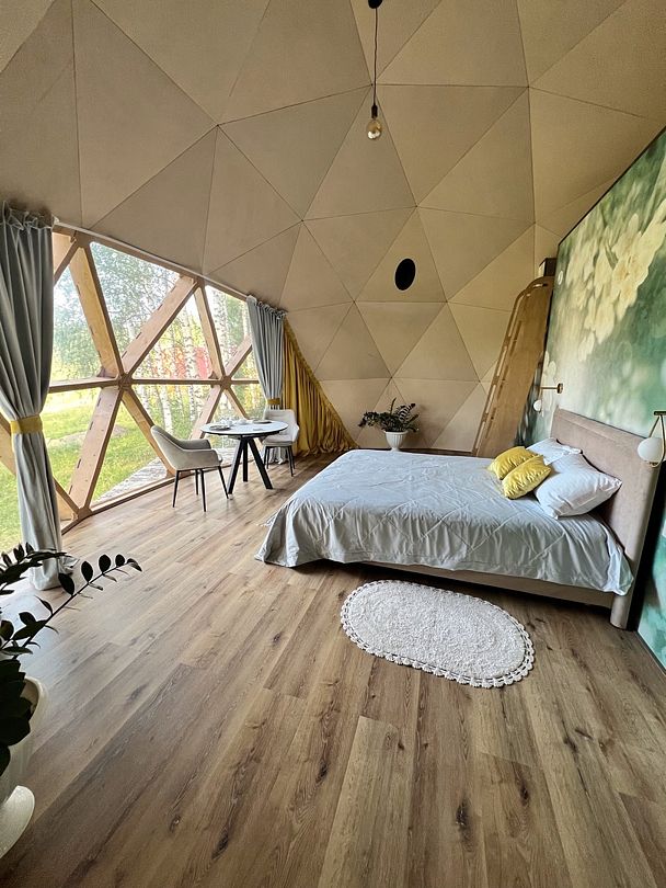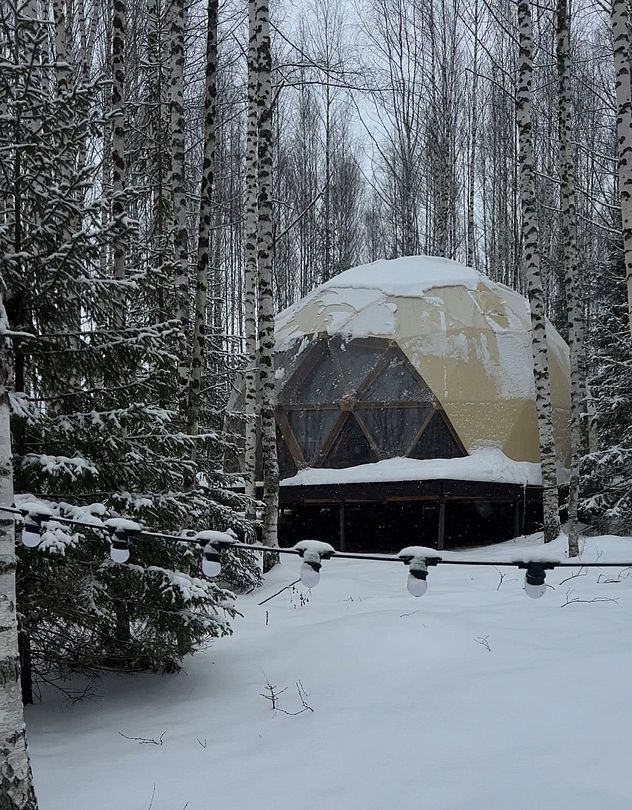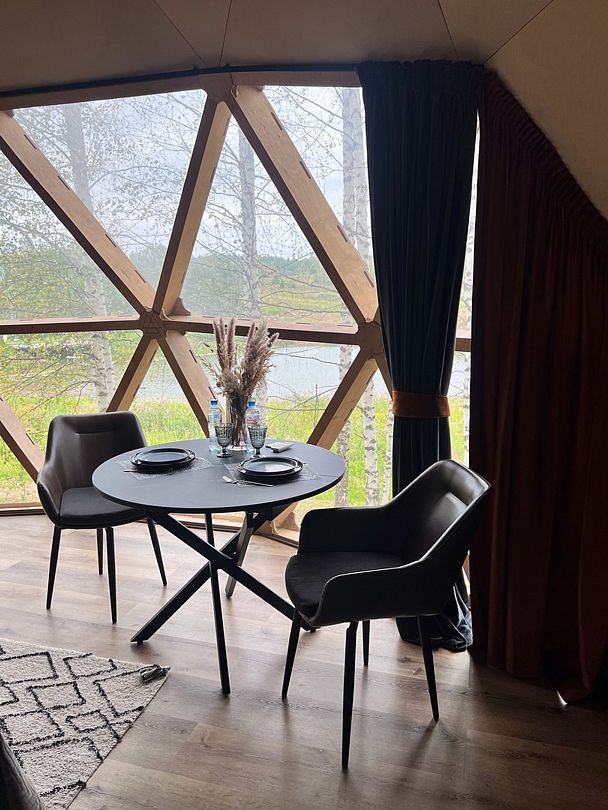 Уникальный сферический дом с панорамными окнами. Завораживающий вид на березовую рощу, гору и озеро. Комфорт отеля среди природы.