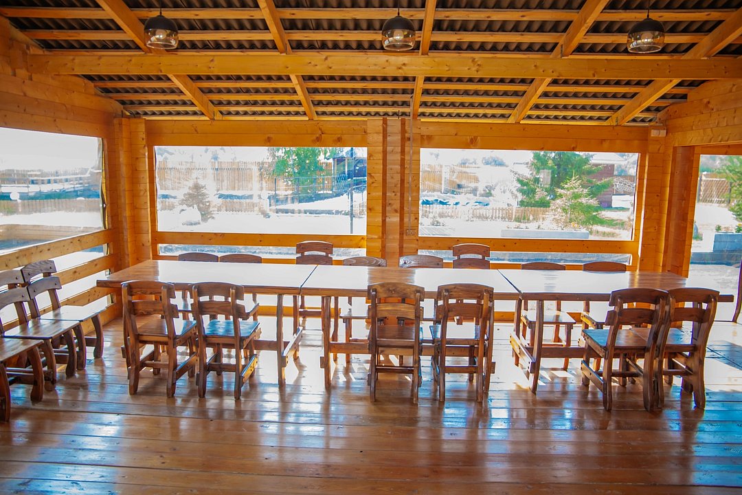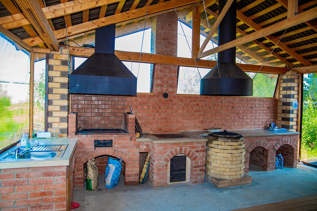Для гостей оборудована зона кухни с мангалом, печью под казан и тандыром, а окна обеспечивают защиту от непогоды. В непосредственной близости расположена детская площадка, что делает это место отличным выбором для семейных встреч и праздников в любое время года.