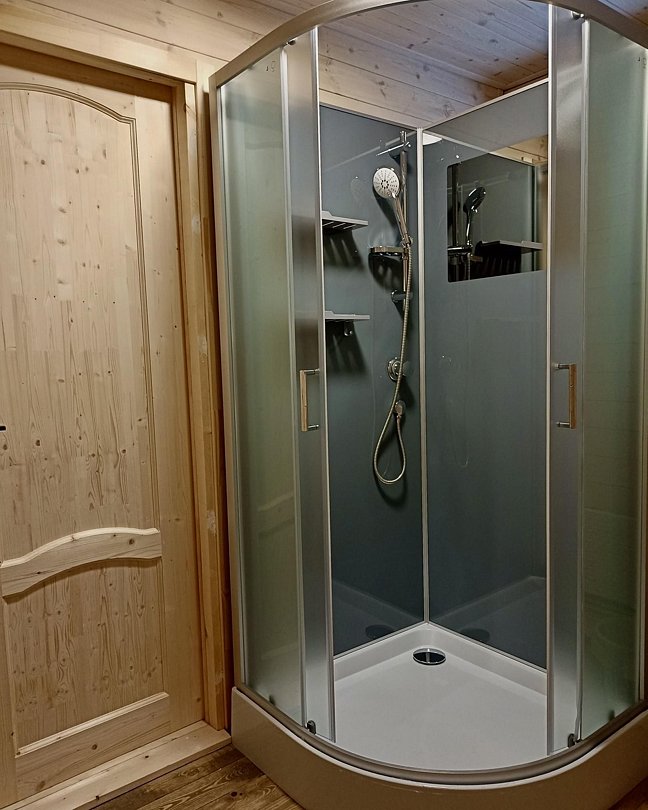 - 1 этаж — двухспальный диван, тумбочка с телевизором, кухонный гарнитур со всем необходимым (электрический чайник, посуда, холодильник, микроволновка), ванная комната (душевая кабинка, туалет и раковина);