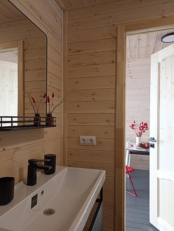 Домик оборудован двумя полутораспальными кроватями с постельным бельем, прикроватной тумбой для личных вещей, есть столик с набором посуды, электрическим чайником и чайными принадлежностями. На входе установлен умывальник с подогревом.