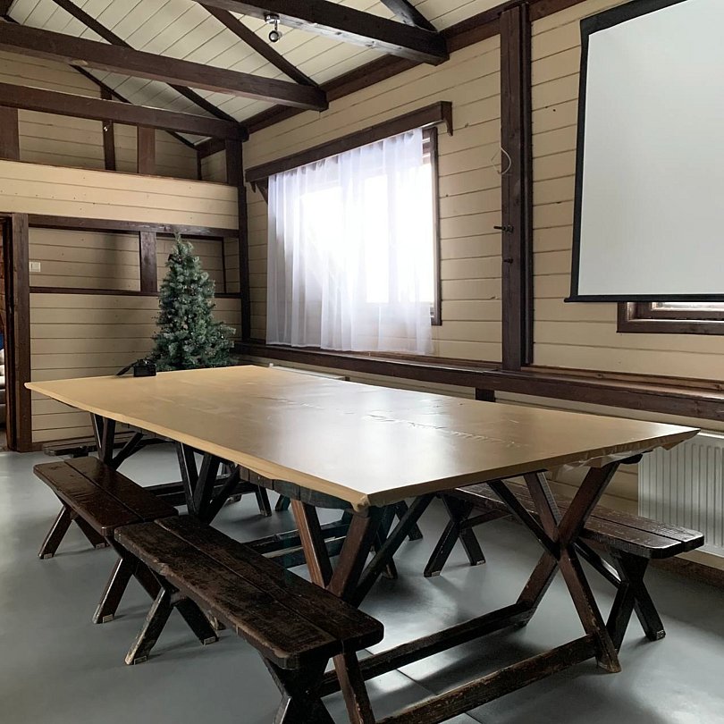 На втором этаже расположена гостевая комната (банкетный зал) с проектором, большим экраном, музыкальным центром, столами и диванами. Рядом с залом 2 двухместных и 1 одноместный номер. Отдельный санузел. Находятся в главном корпусе базы.