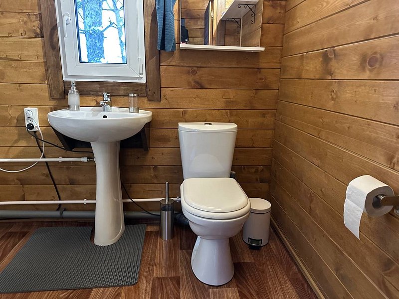 В доме есть все необходимое для отдыха и приготовления еды. Гостиная с кухней, спальня с большой кроватью и комната с двухъярусной кроватью, небольшая прихожая. В гостиной из окна открывается вид на реку Кама. Двухместный раскладной диван, журнальный стол, кухня с мойкой и холодильником, электрический чайник, капсульная кофемашина, микроволновая печь, индукционная двухконфорочной плита, набор посуды. Барная стойка со стульями. В прихожей зеркало и вешалка. Санузел, душевая кабина, раковина, зеркало, полотенца, фен, шампунь и гель для душа. Отапливается инфракрасными обогревателями и конвектором.