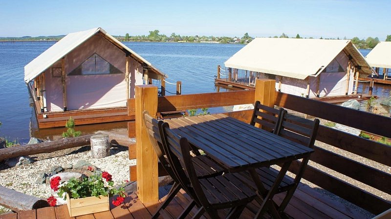 Территория глэмпинга располагает богатой инфраструктурой: живописная набережная, пляж, причалы и пирсы для лодок и гидроциклов, спортивные и детские площадки, беседки, костровые и мангальные зоны, кедровая баня-бочка с захватывающим видом на закат, плавучая баня на воде с закрытой террасой, японский чан Фурако и многое другое.