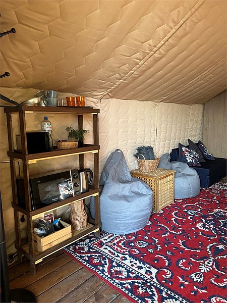 Внутри сафари-тента: двуспальная кровать 160*200 см, одеяла, два пледа, подушки, стол-сундук, детская кроватка по необходимости, диван раскладной 120*200 см (доп. место), две прикроватных тумбочки, светильники, зеркало, сейф, обогреватель, вешалка, полотенца.