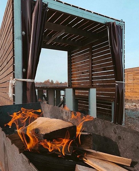 Завтракать, обедать и ужинать вы можете прямо на закрытой террасе. Терраса оборудована мини кухней. В жаркую погоду сафари-тент хорошо вентилируется, в прохладную обогревается инфракрасным обогревателем и конвектором. Есть собственная зона для загара с двумя шезлонгами, гамак. Костровая зона с местами для сидения. По желанию предоставляется мангал с решетками.