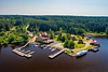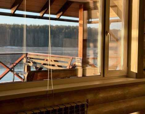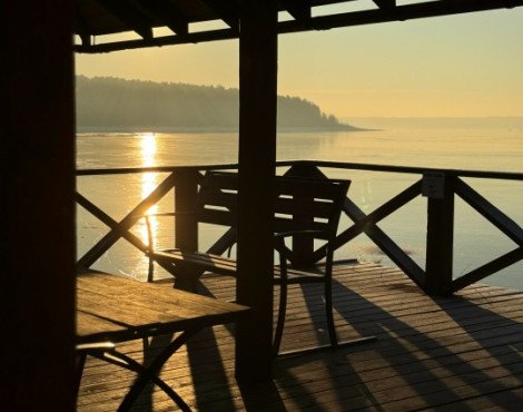 Гостиничный комплекс на берегу реки с панорамным видом на реку и территорию Базы отдыха.
