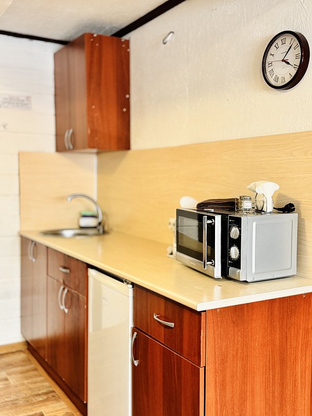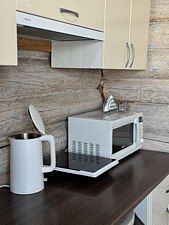 - кухонный гарнитур и все необходимое: микроволновая печь; холодильник; плита; минимальный набор посуды;