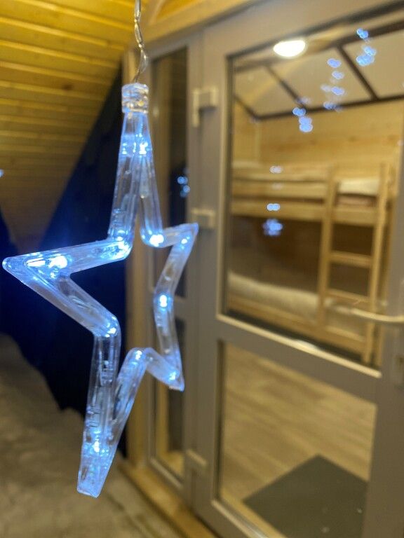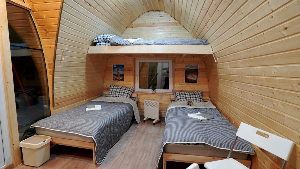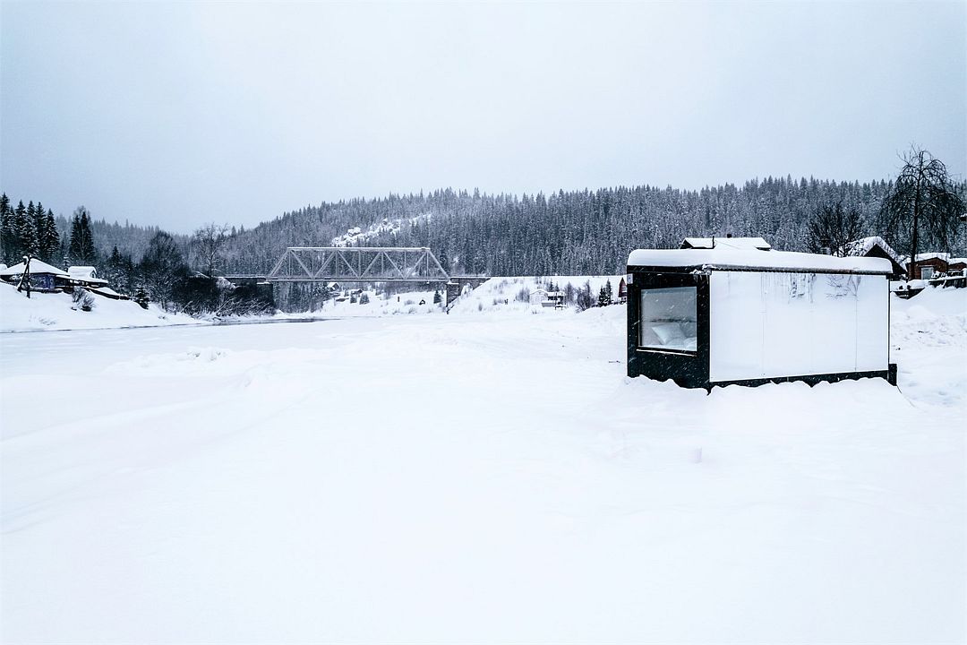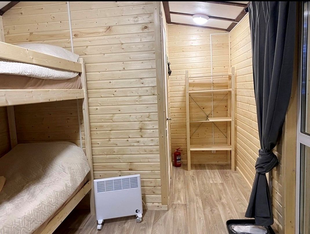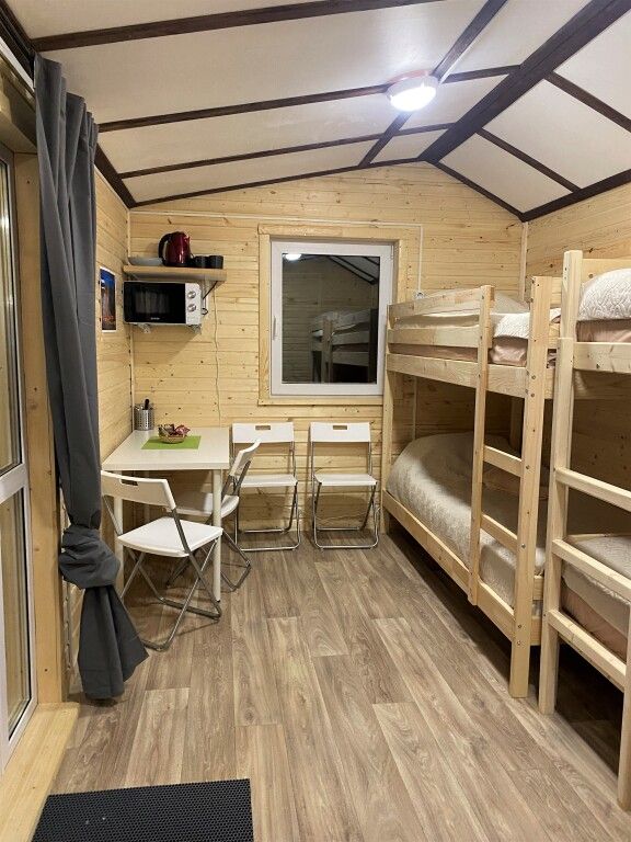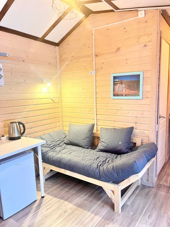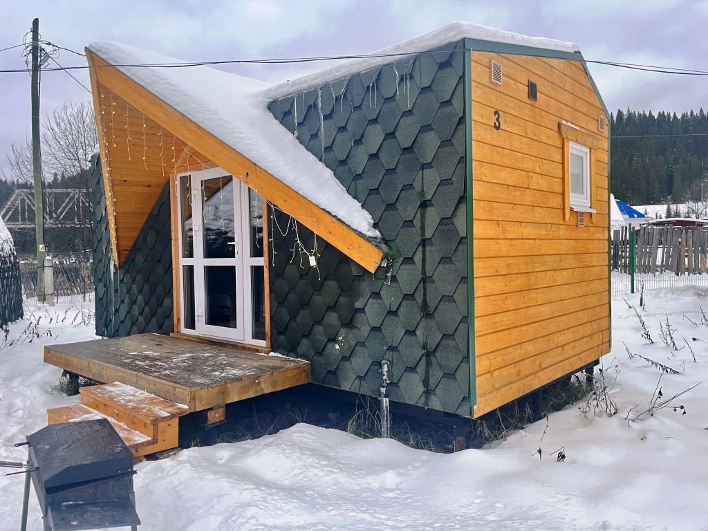 Домик на берегу реки Усьва с панорамным входом. В доме есть 2 двухъярусные кровати, по запросу предоставляется дополнительное спальное место.