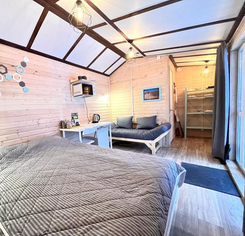 В домах есть все, что нужно для комфортного отдыха на природе: обеденная зона со столом и стульями, микроволновая печь, чайник, небольшой холодильник, необходимая посуда, стеллаж и плечики для вещей, собственный санузел с душем. В «А-доме» находится кухня общего пользования для приготовления еды: плитка и необходимая посуда в вашем распоряжении.