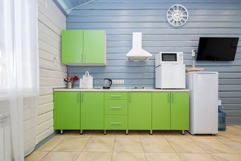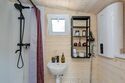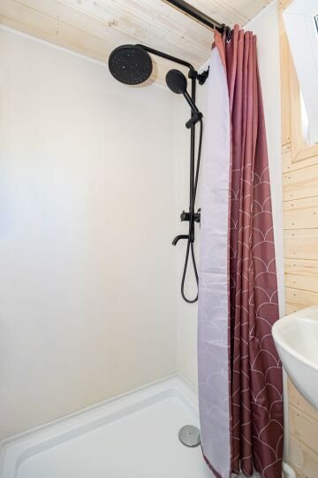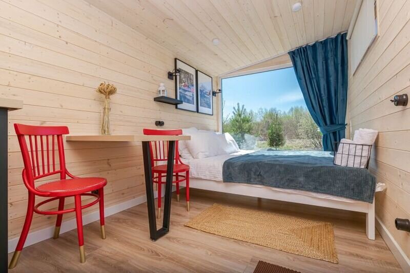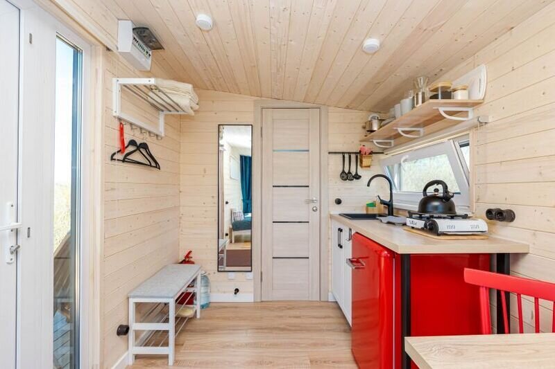 В нем есть двуспальная кровать, теплые полы, кухня со всем необходим необходимым: посуда, холодильник с морозильной камерой, газовая плитка,чайник, раковина. Теплый душ, туалет, постельное белье и полотенца.