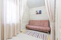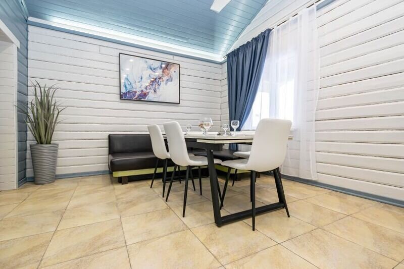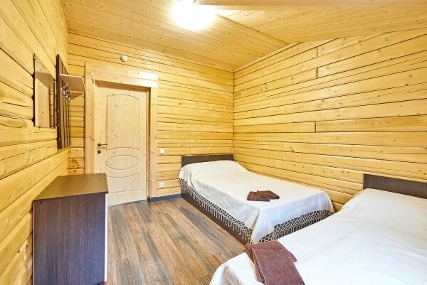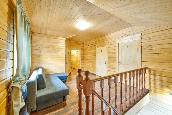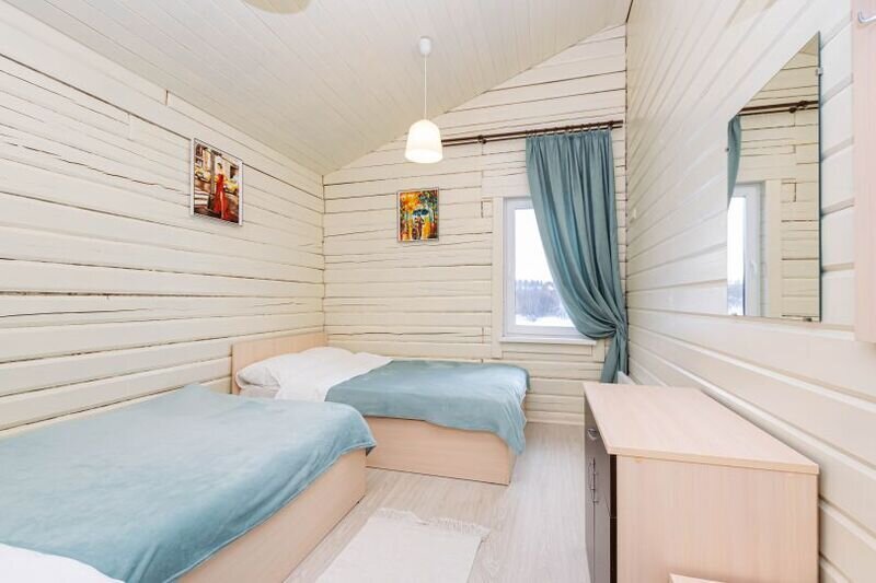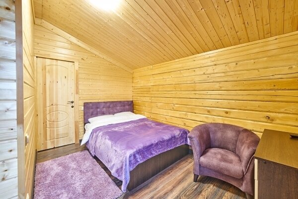 В этом комфортабельном коттедже будет одинаково уютно как семье, так и компании друзей. На первом этаже есть кухня-гостиная, русская баня на дровах, диван, душевые, санузел. На втором этаже две спальные комнаты в одной 2 раздельные 1.5 кровати, во второй спальне 1 двуспальная кровать, в холле двухместный диван. В стоимость проживания включено 3 часа бани.